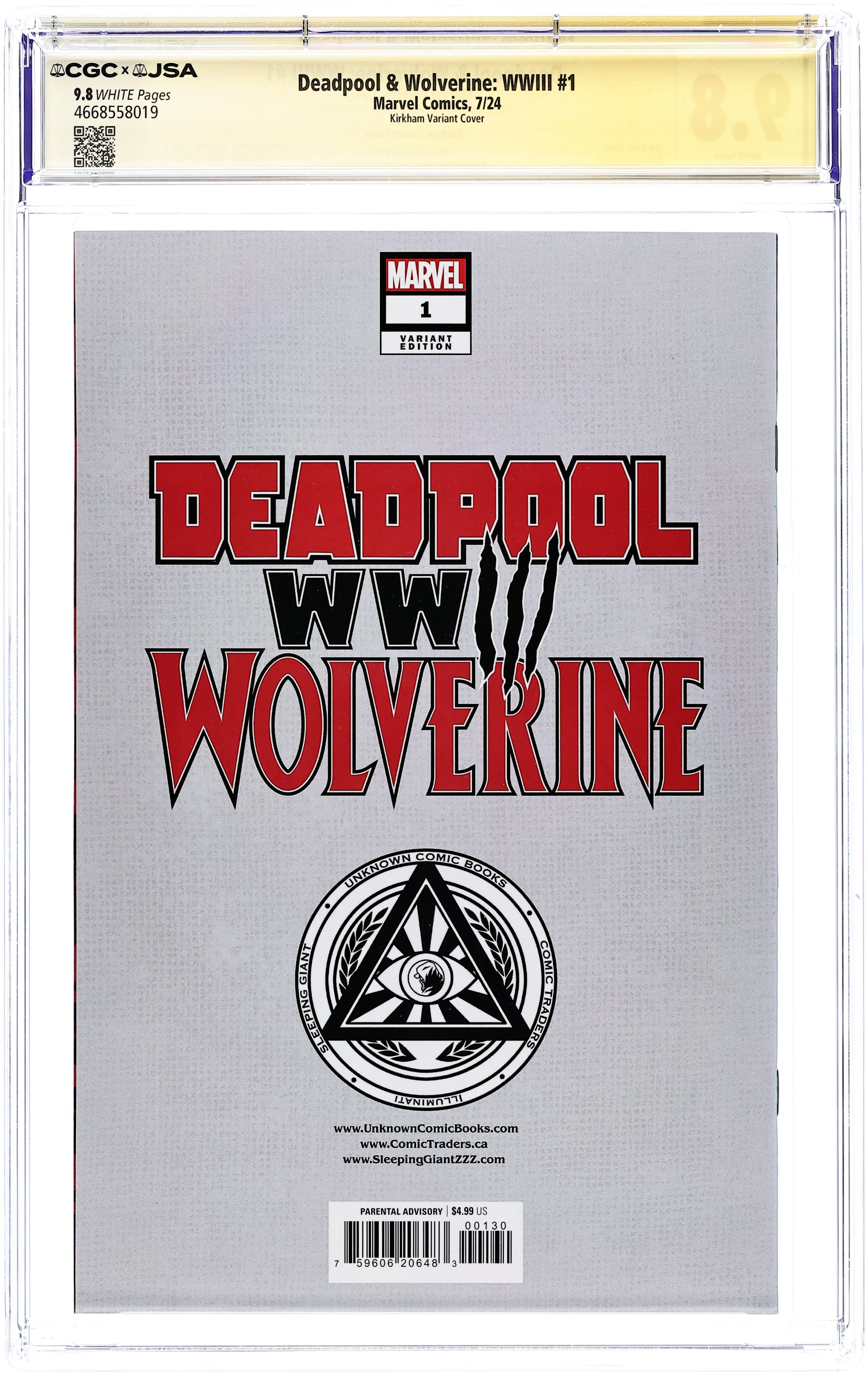 Comics Illuminati (Unknown Comics, Comic Traders, and Sleeping Giant) Exclusive Virgin Cover by Tyler Kirkham. Written by Joe Kelly. Art by Adam Kubert. WADE AND LOGAN'S ALL-OUT WAR CONCLUDES! WWIII has emerged. WOLVERINE is tested beyond his limits. DEADPOOL is…no more?! Discover how this drastic showdown figures into the DELTA's plans. And with THOSE WHO WATCH counting on unending bloodshed, whose will be the last blood to spill? The epic finale to the Deadpool and Wolverine doubleheader that'll be the talk of the summer! 40 pages, full color.