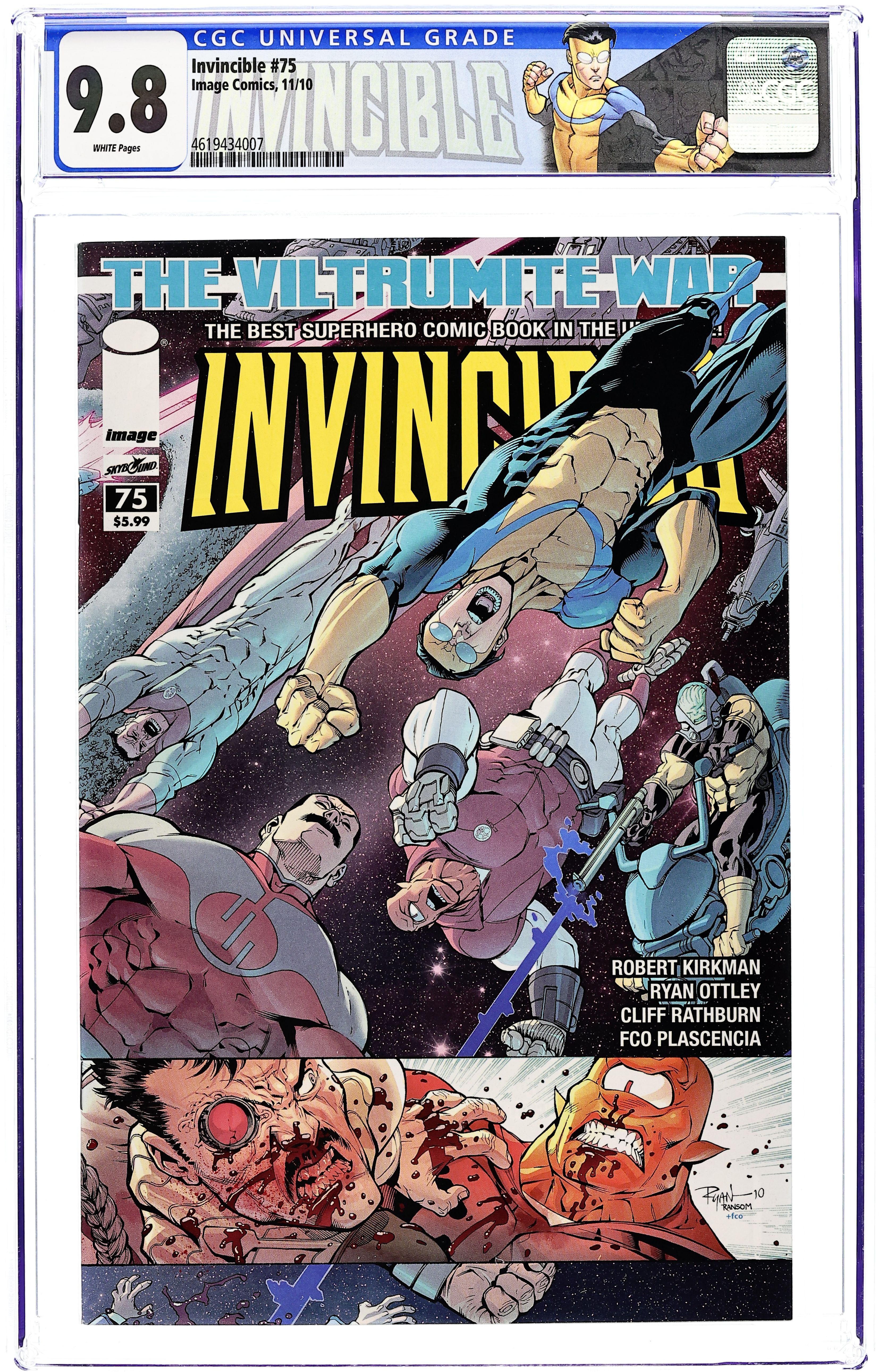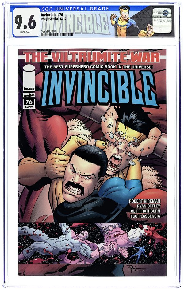 Cover by Ryan Ottley, Ransom Getty and FCO Plascencia. Stories by Robert Kirkman and Aubrey Sitterson. Art by Ryan Ottley, Cory Walker, E. J. Su, Cliff Rathburn, FCO Plascencia, Dave Stewart and Ron Riley. THE VILTRUMITE WAR CONTINUES! Invincible and the Coalition of Planets bring the war to Planet Viltrum! All bets are off as the Coalition forces try to fight their way into the Viltrumite Empire's stronghold. Lives are lost, and a turning point in the war is reached. This issue features a special, over-sized main story by Robert Kirkman, Ryan Ottley, Cliff Rathburn and FCO Plascencia. Plus: Science Dog is back in an all-new back-up story by Robert Kirkman, Cory Walker and Dave Stewart (story is continued from #25 and #50; story concludes in Science Dog Special (2010 Image) #2); Tech Jacket back-up story (part 5 of 8, continues in #77) by Robert Kirkman, Aubrey Sitterson, E. J. Su and Ron Riley; and a pin-up by Ming Doyle. 60 pages, full color. Cover price $5.99.