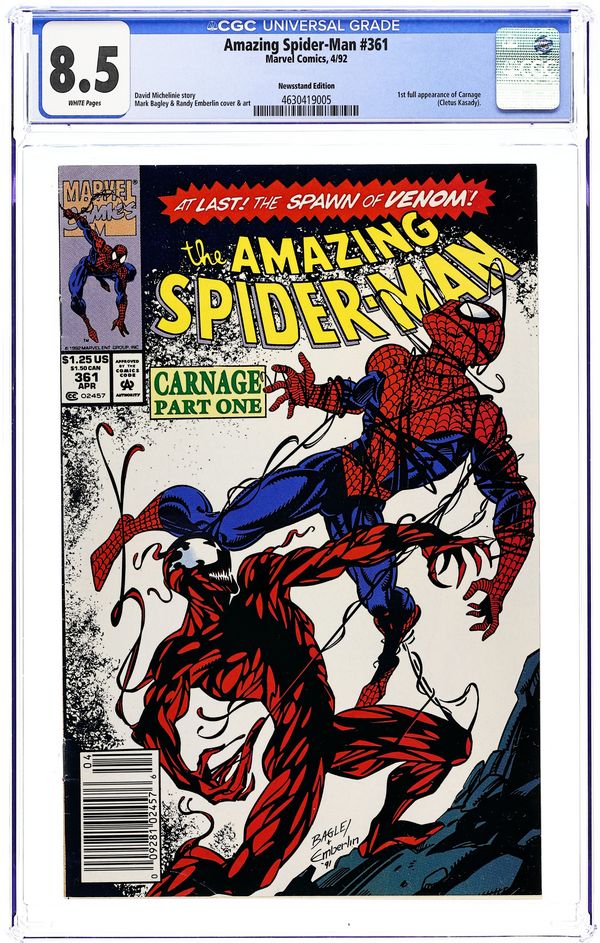 Direct Edition. "Savage Grace!" Part 3 of 3. Script by David Michelinie. Pencils by Mark Bagley. Inks by Randy Emberlin. Cover by Mark Bagley and Randy Emberlin. Carnage takes J. Jonah Jameson hostage and drags him to a heavy metal concert at Madison Square Garden! The psychotic killer plans to execute JJJ in front of thousands of headbangers! But before Carnage can deliver the deathblow, Spider-Man and Venom strike! The ferocious fight leads into the subway tunnels and then back onto the concert stage! Where thanks to MSG's awesome sound system, the web-slinger tries to knock out both Carnage and Venom! The wall-crawler's ploy better work, because double-crossing Venom could have lethal consequences! A fantastic finish! First appearances of the Richard Parker and Mary Parker life model decoys (LMD's). Cameo appearances by Joe Robertson, Mr. Fantastic, and the Human Torch. (Notes: Venom appears next in the one-shot: Spider-Man Special Edition -- The Trial of Venom (1992). Carnage returns in the first issue of Spider-Man Unlimited (1993 1st series) to kick off the Maximum Carnage saga.) 36 pages. $1.25 cover price. Cover price $1.25.