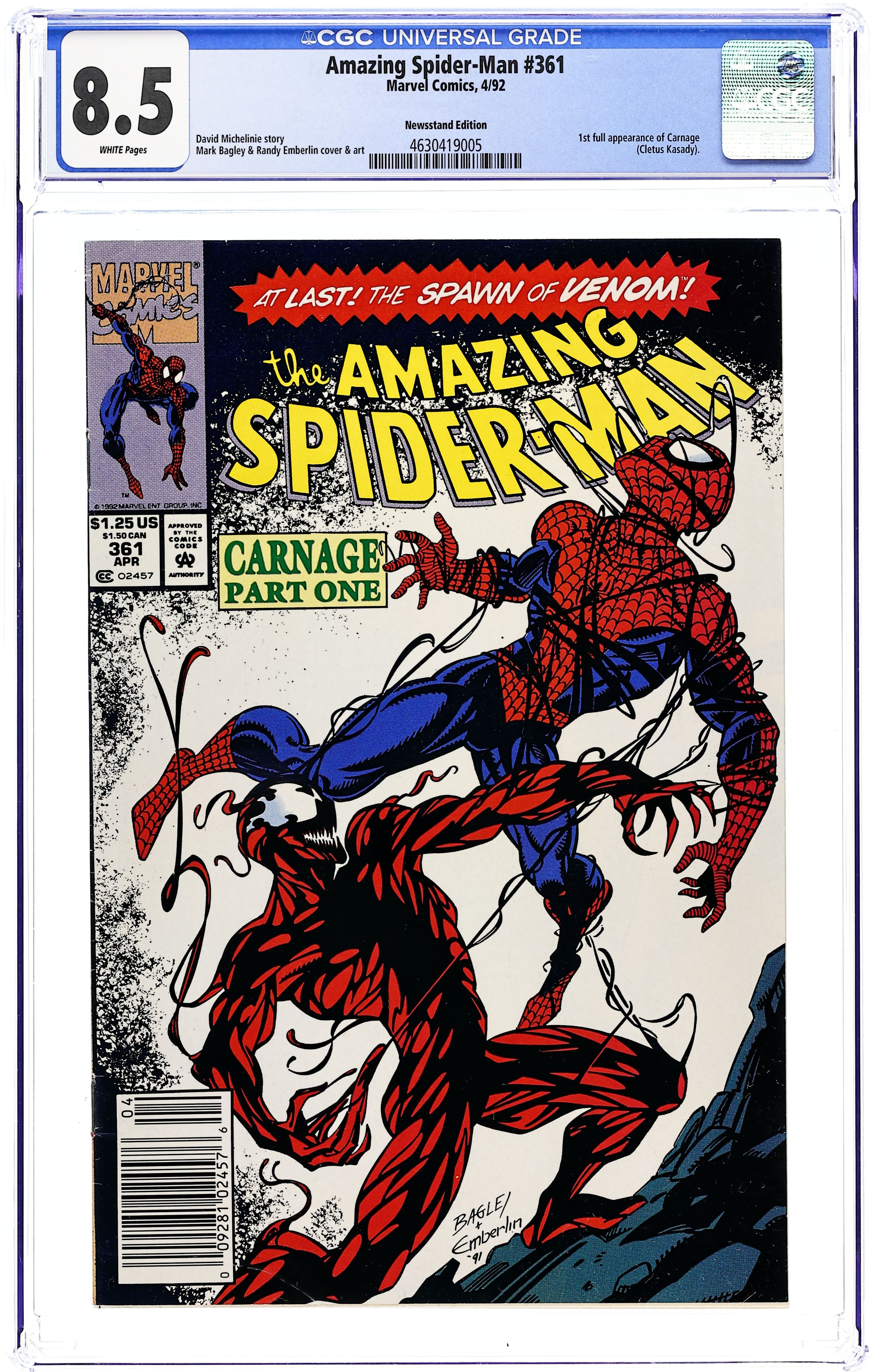 First Printing. Newsstand Edition. First (full) appearance of Carnage in "Savage Genesis!" Part 1 of 3. Script by David Michelinie. Pencils by Mark Bagley. Inks by Randy Emberlin. Cover by Mark Bagley and Randy Emberlin. Blood runs in the streets as a serial killer roams New York City! And as the web-slinger investigates the murders, he notices a very disturbing similarity to another killer's modus operandi! In a burned-out building in Brooklyn, the spectacular one comes face-to-face with his new homicidal foe...Carnage! Can the wall-crawler end Cletus Kasady's rampage in their very first encounter? Cameo appearances by Aunt May and Mary Jane Watson. Flashback cameo by Venom. (Note: This three-part story was reprinted in 2011 in the trade paperback: Spider-Man -- The Vengeance of Venom.) 36 pages, full color. $1.25 cover price. NOTE: Most of these were distributed with slight printer tears in the bottom edge of the cover. Cover price $1.25.