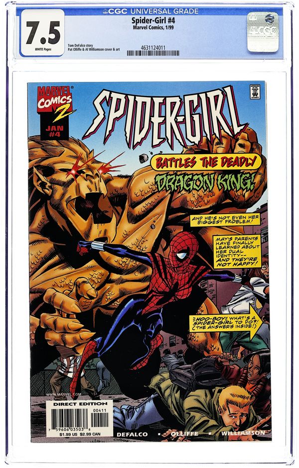 Cover pencils by Pat Olliffe. Deadly is the Dragon King starring Spider-Girl, script by Tom DeFalco, pencils by Pat Olliffe, inks by Al Williamson; May's parents find out that she's Spider-Girl; Spider-Girl fights the Dragon King. 36 pgs. $1.99. Cover price $1.99.