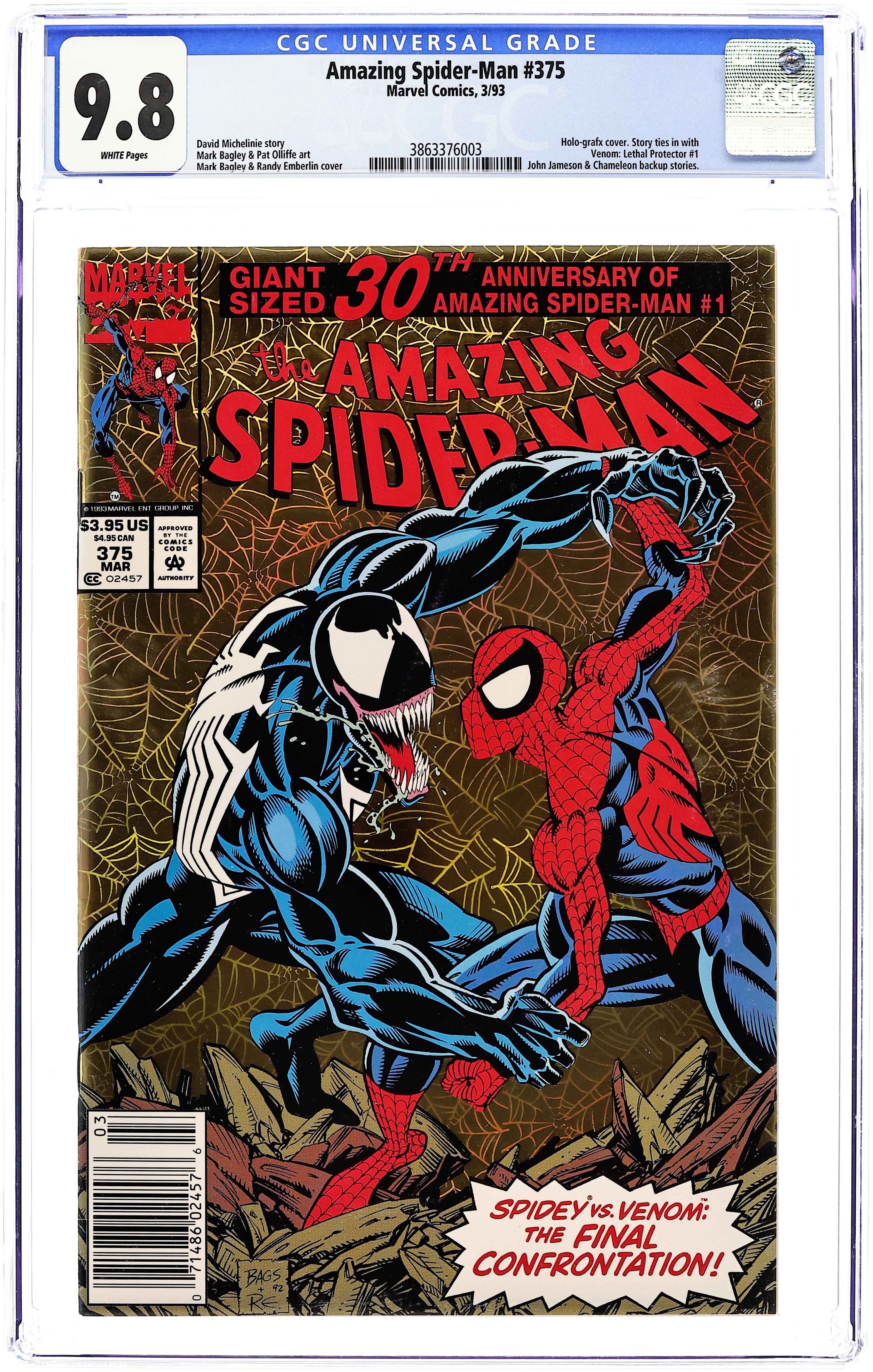 Direct Edition. 30th Anniversary issue of Amazing Spiderman #1. "The Bride of Venom" Part 2 of 2. Script by David Michelinie. Pencils by Mark Bagley. Inks by Randy Emberlin. Gold foil holografix cover by Mark Bagley and Randy Emberlin. Inside an abandoned Brooklyn amusement park, the Lethal Protector holds Richard and Mary Parker captive! The disturbed Venom thinks he's just doing what's best for Peter's parents! But that's not going to work! No way, no how! So, the wall-crawler heads to the park knowing a fierce fight awaits! However, the web-slinger may have help this time from a very unlikely source... Eddie Brock's ex-wife! Wow, will there be a family reunion atop the Ferris wheel? Or perhaps a funeral beneath it? One way or another, the Amazing Spider-Man and Venom battle for the last time! Cameo appearances by Silver Sable, Battlestar, Mary Jane Watson, and J. Jonah Jameson. Second story: "True Friends!" Script by Tom DeFalco. Pencils by Patrick Olliffee. Inks by Mark McKenna. Aware of what the Human Torch did to Empire State University, Spider-Man vows to bring his friend to justice. Cameo appearance by Silver Sable. Plot crosses over with Fantastic Four 373 & 374. Third story: "The Monster Within" Script by Eric Fein. Art by Dan Panosian. JJJ tries to get his son, John Jameson, started in the field of journalism. Fourth story: "Echoes..." Script by Terry Kavanagh. Pencils by Aaron Lopresti. Inks by Don Hudson. The Chameleon visits the grave of Kraven the Hunter. (Notes: Venom appears next in the first issue of his Lethal Protector (1993) series. The letters page includes a statement of ownership: average print run 660,958. average paid circulation 544,900.) 68 pages. Cover price $3.95.