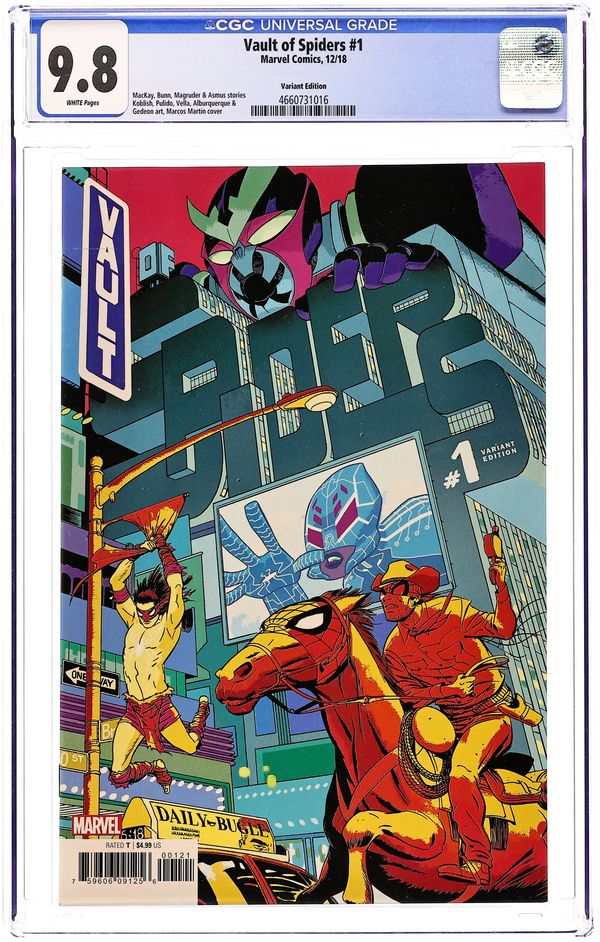 Written by Jed MacKay, Cullen Bunn, Nilah Magruder, James Asmus. Art by Scott Koblish, Andres Mossa, Javier Pulido, Munsta Vicente, Sheldon Vella, Alberto Alburqeurque, Andrew Crossley, and Andres Mossa. Cover by Marcos Martin. A SPIDER-GEDDON TIE IN! Only a Spider-Army can stop the end of the Multiverse! Meet Web-Slinger, the Spider-Man from the Wild West, in an unforgettable story by CULLEN BUNN (X-MEN BLUE) and JAVIER PULIDO (SHE-HULK). He is the Emissary from Hell, he is SUPAIDAMAN! The Spider-Man from the live-action SPIDER-MAN show that aired in Japan in the 1970s is back in comics form in an insane story by JED MACKAY (EDGE OF SPIDER-GEDDON) and SHELDON VELLA (DEADPOOL, SPIDER-VERSE). And that's just a glimpse into the VAULT OF SPIDERS! 36 pages, full color. Rated T Cover price $4.99.