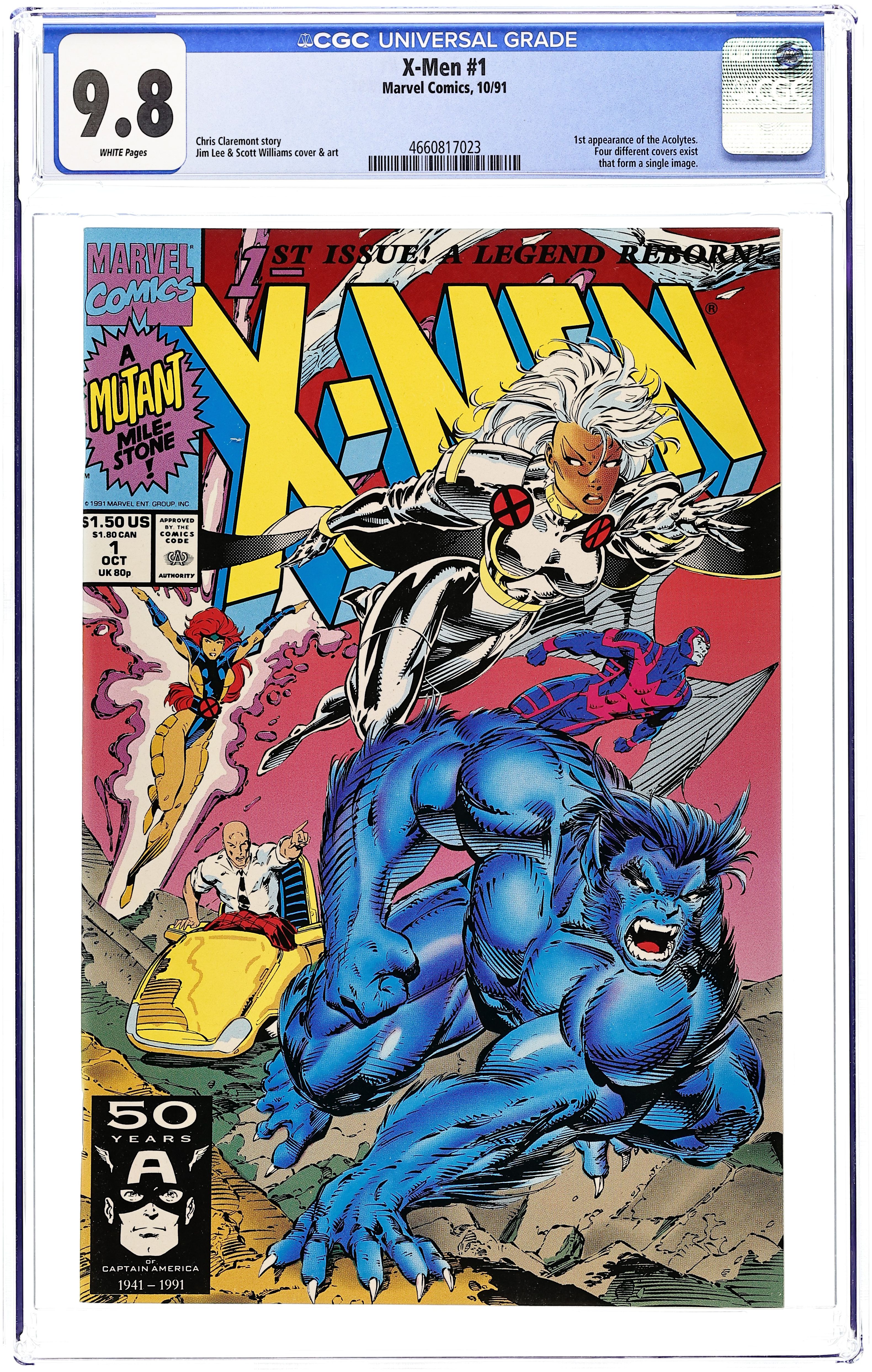 Direct Edition. Beast/Storm double cover. Cover pencils by Jim Lee (signed), inks by Scott Williams. Rubicon, script by Jim Lee (Co-Plot) and Chris Claremont, pencils by Jim Lee, inks by Scott Williams; Magneto forms the Acolytes and proclaims Asteroid M a haven for mutants everywhere; But the rest of the world doesn't see it that way; Nick Fury cameo. 2-page pin-up: gallery of X-Men villains. X-Men Sketchbook by Jim Lee. Cover price $1.50. NOTE: Cover A connects to covers 1B, 1C, and 1D to form a single giant image. Cover price $1.50.