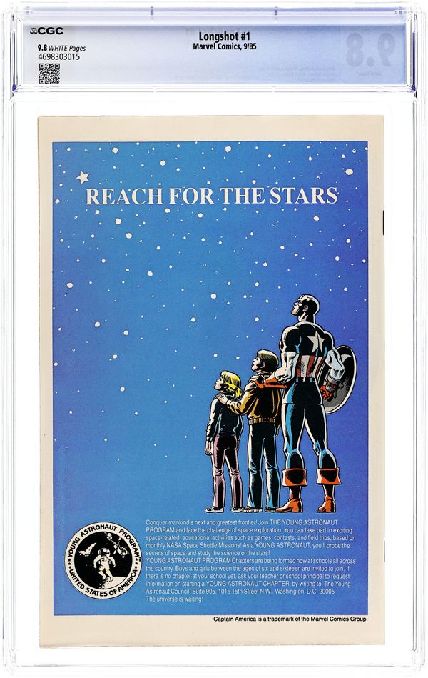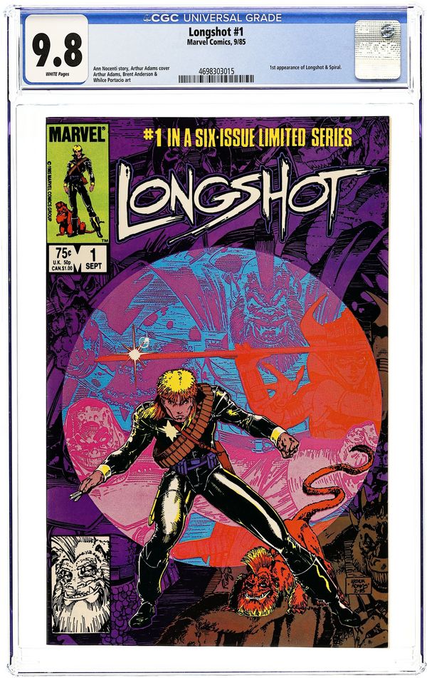 Newsstand Edition. 1st Art Adams pro work. Arriving on Earth unsure of his own identity, Longshot tries to rescue a kidnapped baby in "A Man Without a Past." Script by Ann Nocenti. Pencils by Arthur Adams (his first pro work). Inks by Whilce Portacio & Anderson. Cover by Adams. 1st appearance of Longshot and Spiral. Cover price $0.75.