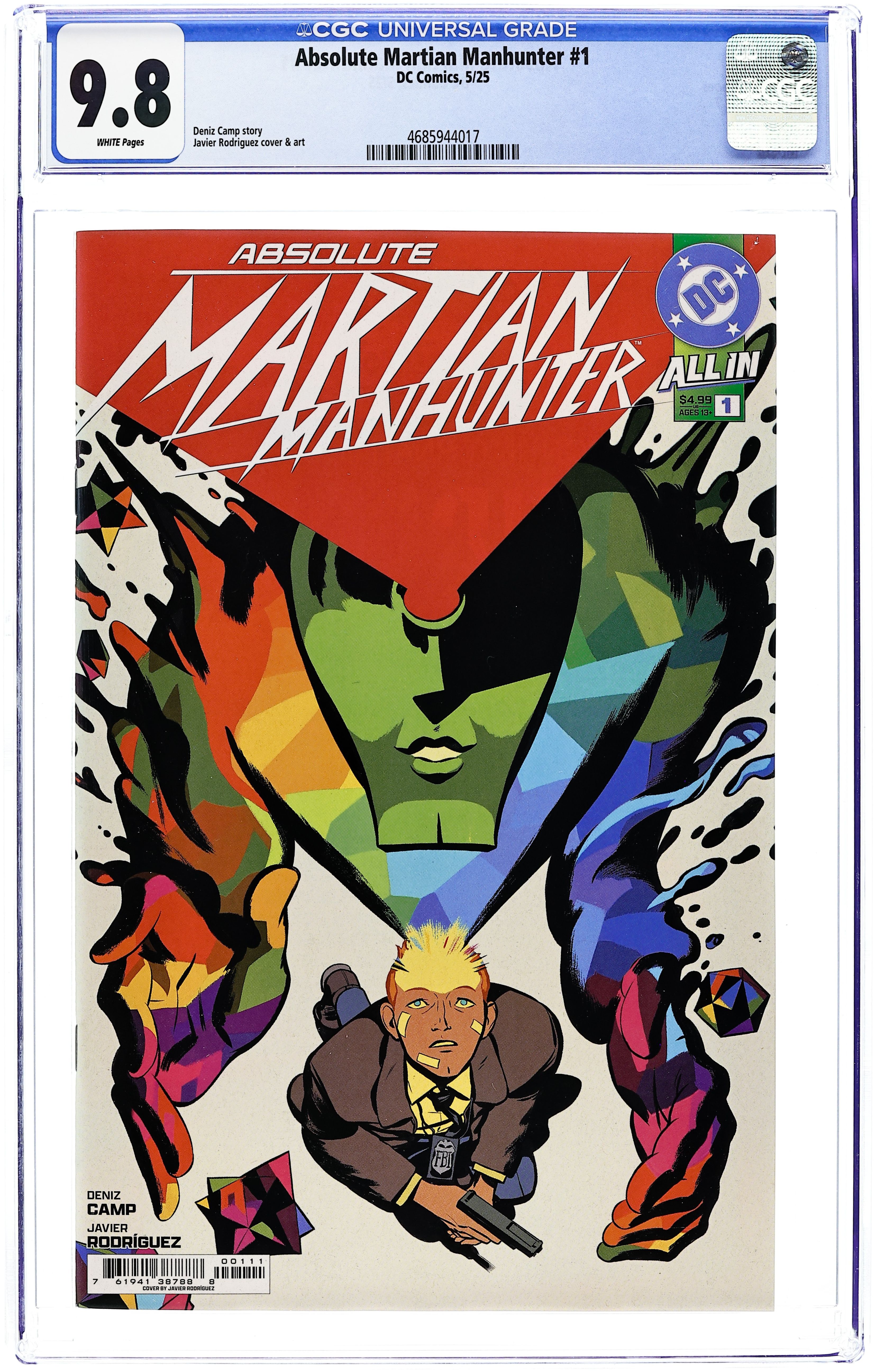 Written by Deniz Camp. Art by Javier Rodriguez. Cover by Javier Rodriguez. DENIZ CAMP AND JAVIER RODRIGUEZ TRANSFORM THE ABSOLUTE UNIVERSE! Beyond Mars...beyond physical form...beyond Human Understanding...all that's left is the ultimate alien: the Absolute Martian Manhunter! 36 pages, full color. Rated T+ Cover price $4.99.