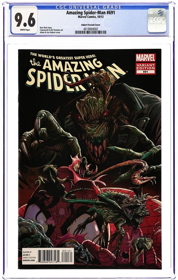 Limited 1 for 25 Variant Cover by Adam Kubert and Joe Kubert. (W) Dan Slott. (A) Giuseppe Camuncoli, Mario Del Pennino, Klaus Janson, Daniel Green. No Turning Back: Part 4 of 4 'No Turning Back' comes to an epic conclusion as only one man on Earth has a chance of helping Spider-Man stop the Lizard. And his name is Curt Connors. Plus, a shocking development that will set things in motion... for AMAZING SPIDER-MAN #700! Be sure to pick this issue up fast, because you can bet it's going to be VERY important later. You've been warned! 32 pgs. Cover price $3.99.