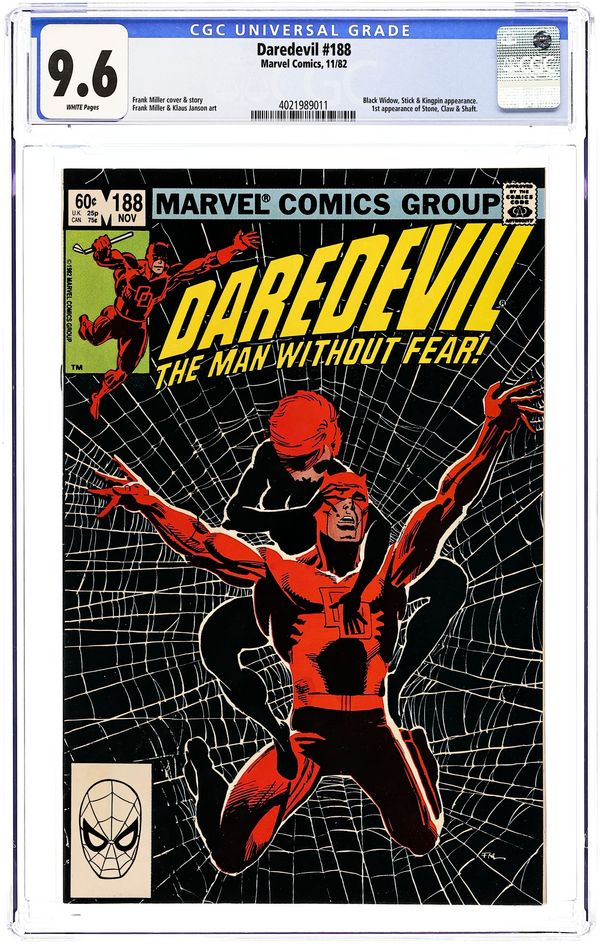 Direct Edition. Cover art by Frank Miller. The Widow's Bite, script by Frank Miller, pencils by Frank Miller (layouts) and Klaus Janson (finished art), inks by Klaus Janson; The Widow is dying of poison she got in a fight with the Hand and is desperately trying to find Daredevil to help; Matt is recovering his hyper senses in an isolation chamber under the watchful eye of Stick and his ninja. Frank Miller's splash page for this issue demonstrating the difference between Frank Miller's rough breakdown sketch and Klaus Janson's pencilled art; Replaces letters page. 36 pgs. Cover price $0.60. Cover price $0.60.