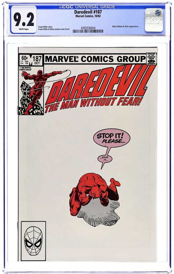 Direct Edition. Cover pencils by Frank Miller, inks by Klaus Janson. Overkill, script by Frank Miller, pencils by Frank Miller (layouts) and Klaus Janson (finished art), inks by Klaus Janson; DD's hyper senses continue to get worse and he seeks out Stick for help; in a fight with the Hand, the Black Widow is poisoned; appearances by the Black Widow (in a new costume), Nick Fury, and ninja assassins. 36 pgs. Cover price $0.60. Cover price $0.60.