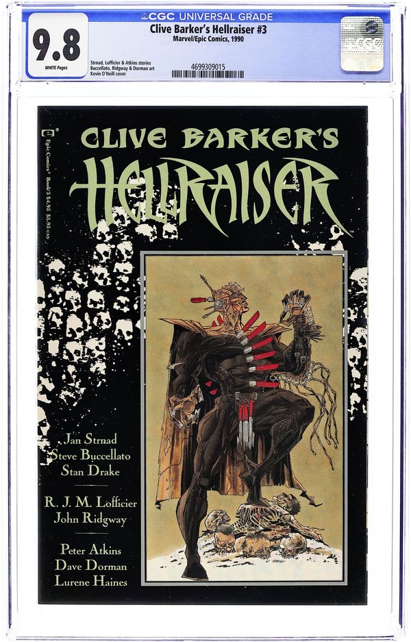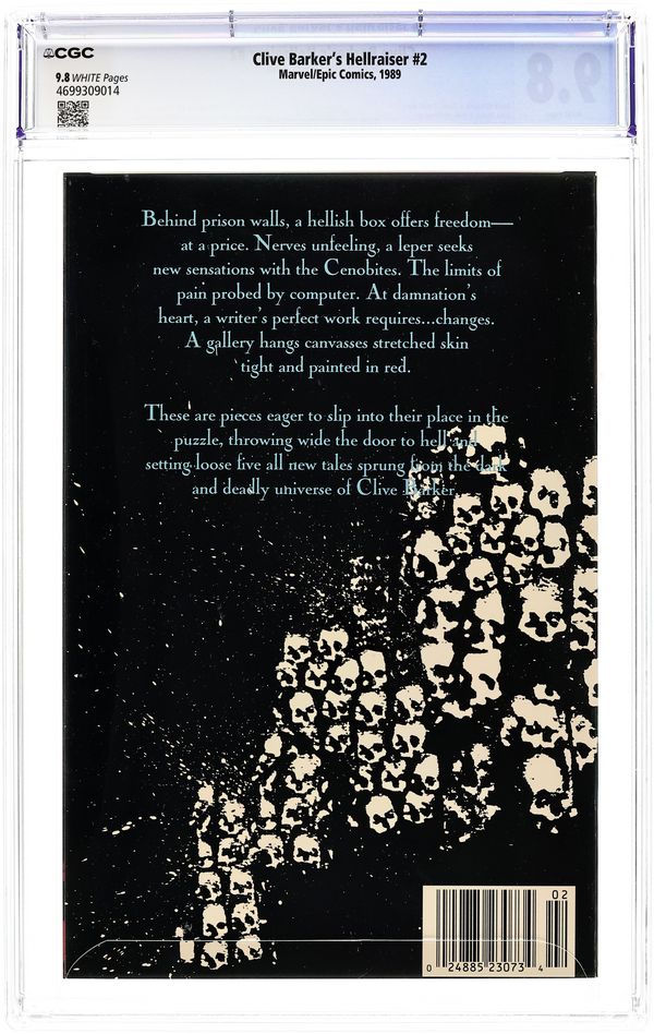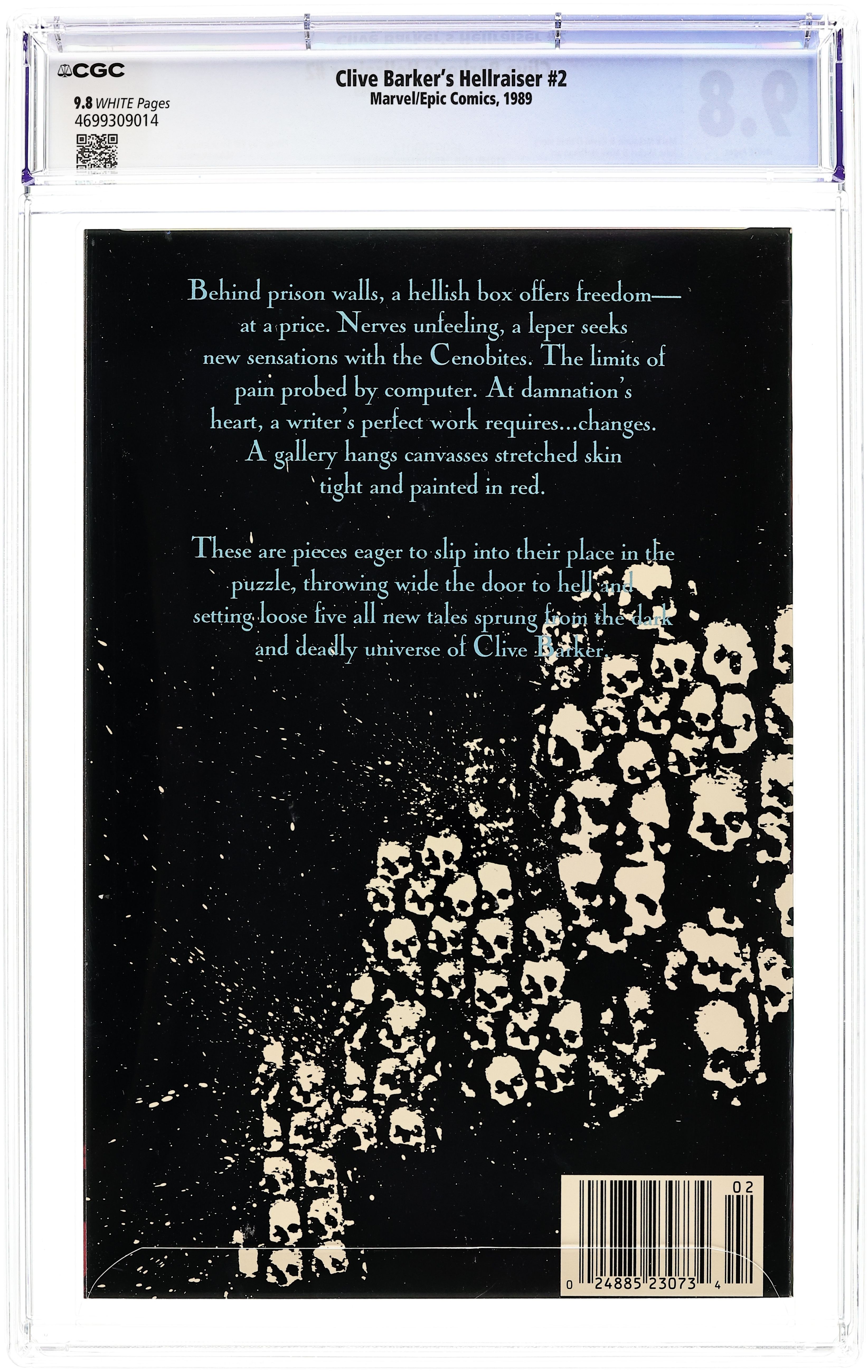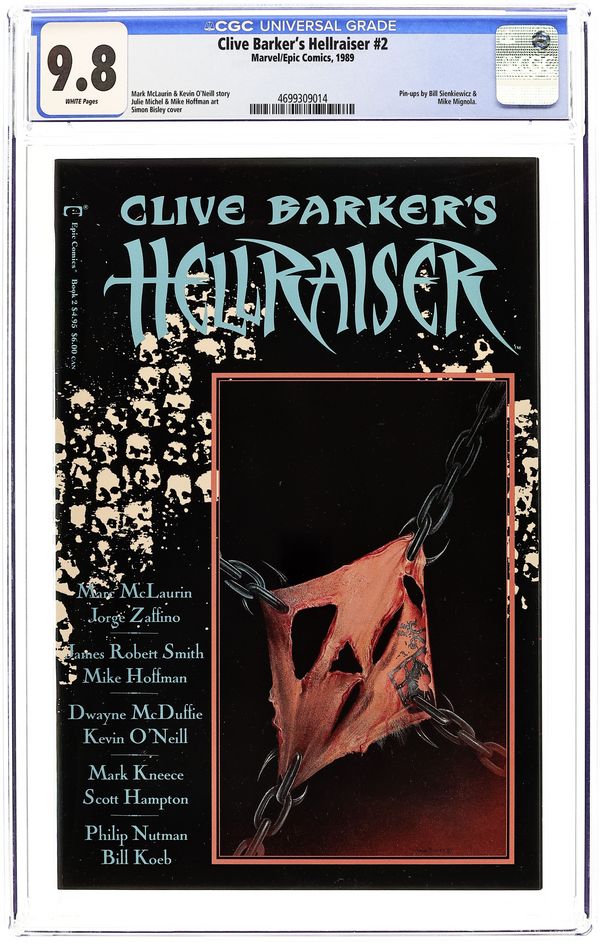 Cover by Simon Bisley. Behind prison walls, a hellish box offers freedom - at a price! Nerves unfeeling, a leper seeks new sensations with the Cenobites. The limits of pain probed by computer. A damnation's heart, a writer's perfect work requires...changes. A gallery hangs canvasses stretched skin tight and painted in red. These are pieces eager to slip into their place in the puzzle, throwing wide the door to hell and setting loose five all new tales sprung from the dark and deadly universe of Clive Barker. Includes Tales by Marc McLaurin, Jorge Zaffino, James Robert Smith, Mike Hoffman, Dwayne McDuffie, Kevin O'Neil, Mark Kneece, Scott Hampton, Philip Nutman, and Bill Koeb. Featuring pin-ups by Jon J. Muth, Bill Sienkiewicz, and Mike Mignola. 64 pages, FC. Cover price $4.95.