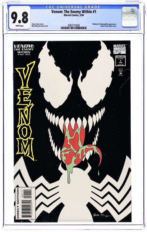 Newsstand Edition. This Venom limited series premiere features a cardstock cover with glow-in-the-dark detail and is printed on glossy stock. Everybody's favorite symbiote mixes it up with Morbius when a horde of demons tries to take over San Francisco. Will the Lethal Protector end up dead? Written by Bruce Jones. Art and cover by Bob McLeod. Cover price $2.95.