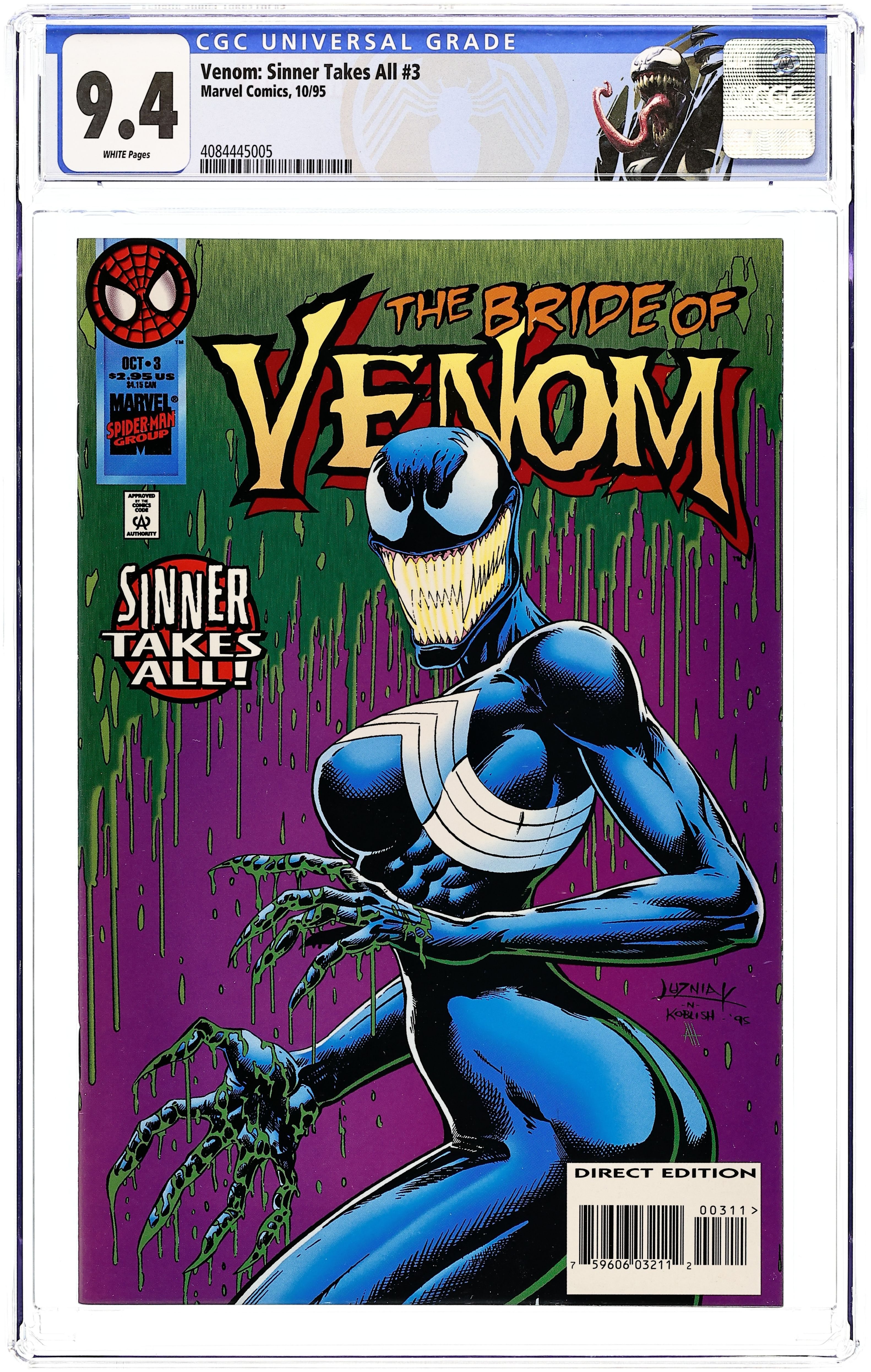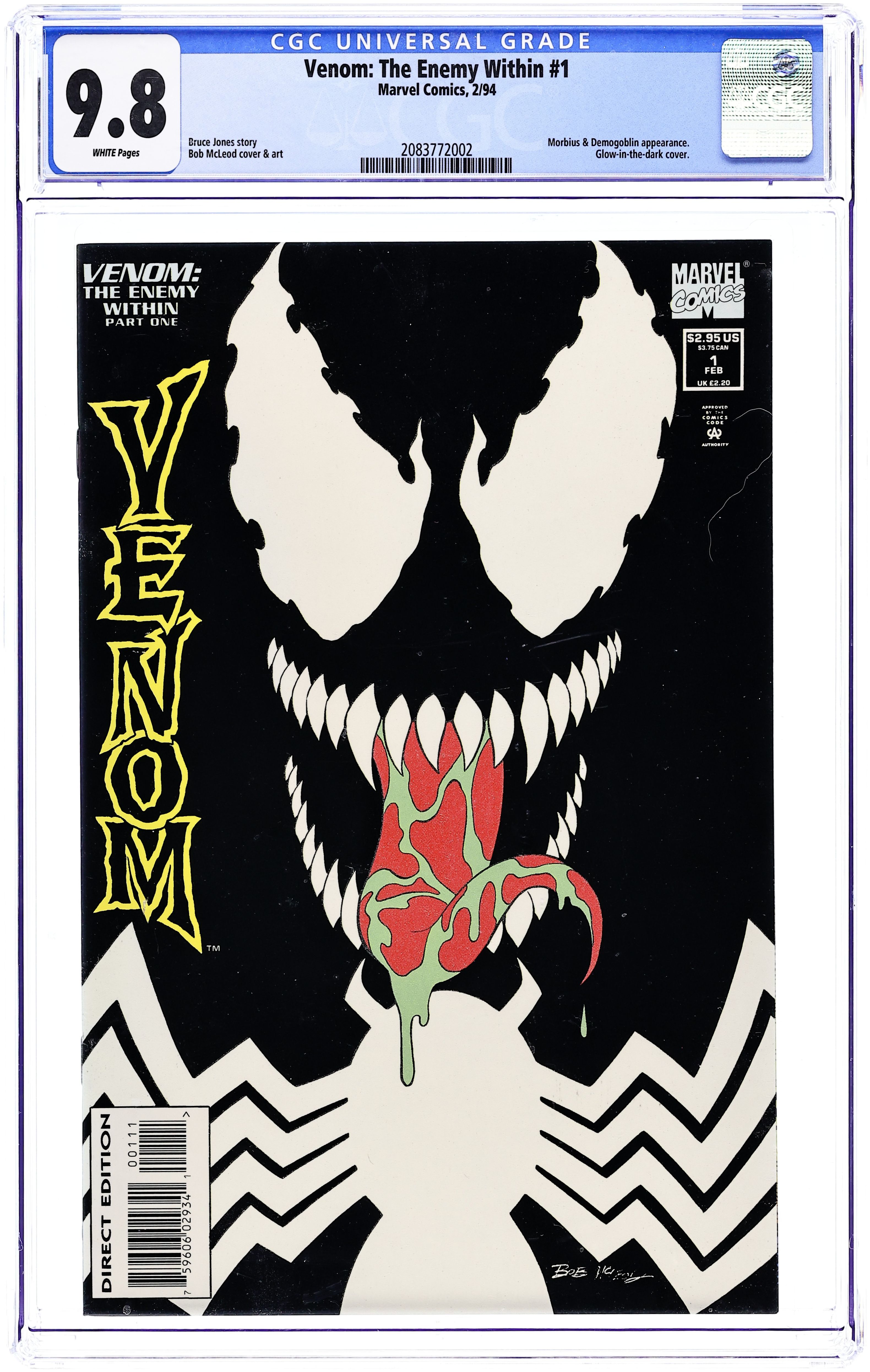 Direct Edition. This Venom limited series premiere features a cardstock cover with glow-in-the-dark detail and is printed on glossy stock. Everybody's favorite symbiote mixes it up with Morbius when a horde of demons tries to take over San Francisco. Will the Lethal Protector end up dead? Written by Bruce Jones. Art and cover by Bob McLeod. Cover price $2.95.