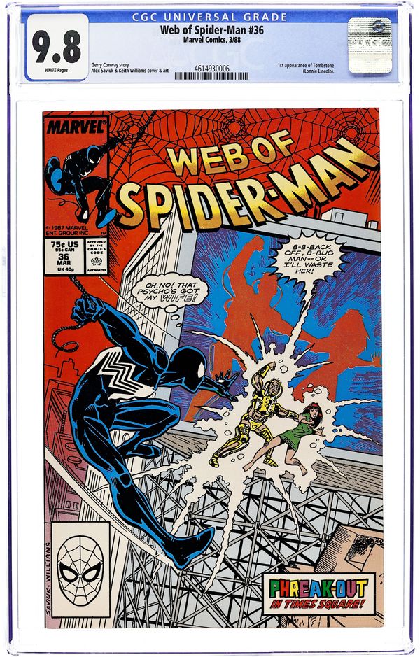 Direct Edition. "Phreak-Out!" Story by Gerry Conway. Art by Alex Saviuk and Keith Williams. The young scientist from the previous issue is still on the loose, and now he has built his own powerful exo-skeleton. The Phreak goes to Peter Parker's apartment and abducts Mary Jane; setting the stage for a showdown with Spider-Man over Times Square! Meanwhile, Joe Robertson is horrified to see a chilling old acquaintance and a soon-to-be new villain for Spider-Man. First appearance of Tombstone. 32 pages Cover price $0.75.
