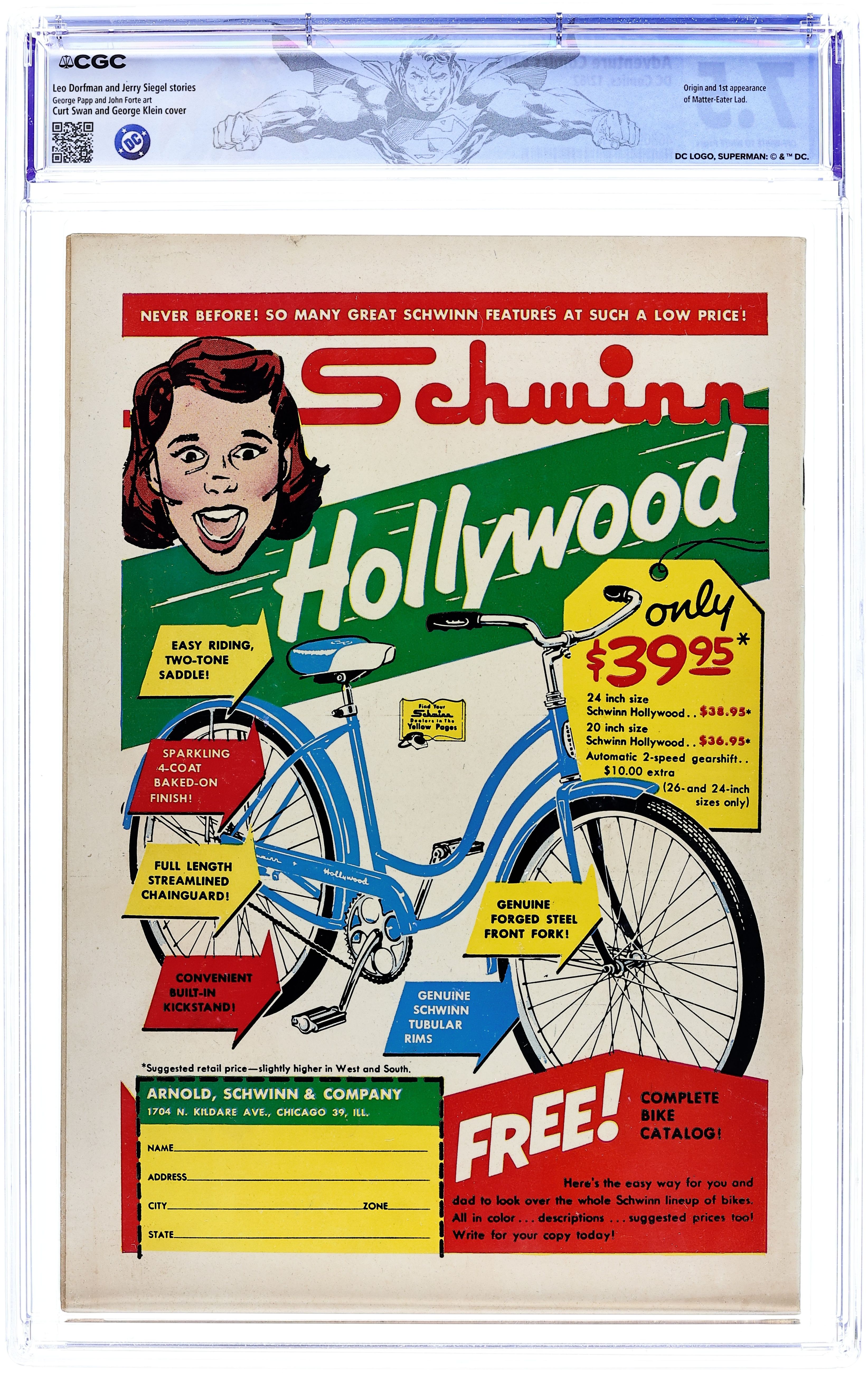 Cover pencils by Curt Swan, inks by Stan Kaye. 1st appearance of the Phantom Zone in The Phantom Superboy, script by Robert Bernstein, art by George Papp; After Professor Lang finds a box of Kryptonian weapons, Superboy is accidentally projected into the Phantom Zone, the place where Kryptonian criminals were exiled. A Salute to Our American Indians public service announcement, script by Jack Schiff, art by Bernard Baily. The Lion with the Double Identity starring Congorilla, script by Robert Bernstein, art by Howard Sherman. Little Pete humor page by Henry Boltinoff. 36 pages, Full Color. Cover price $0.10.