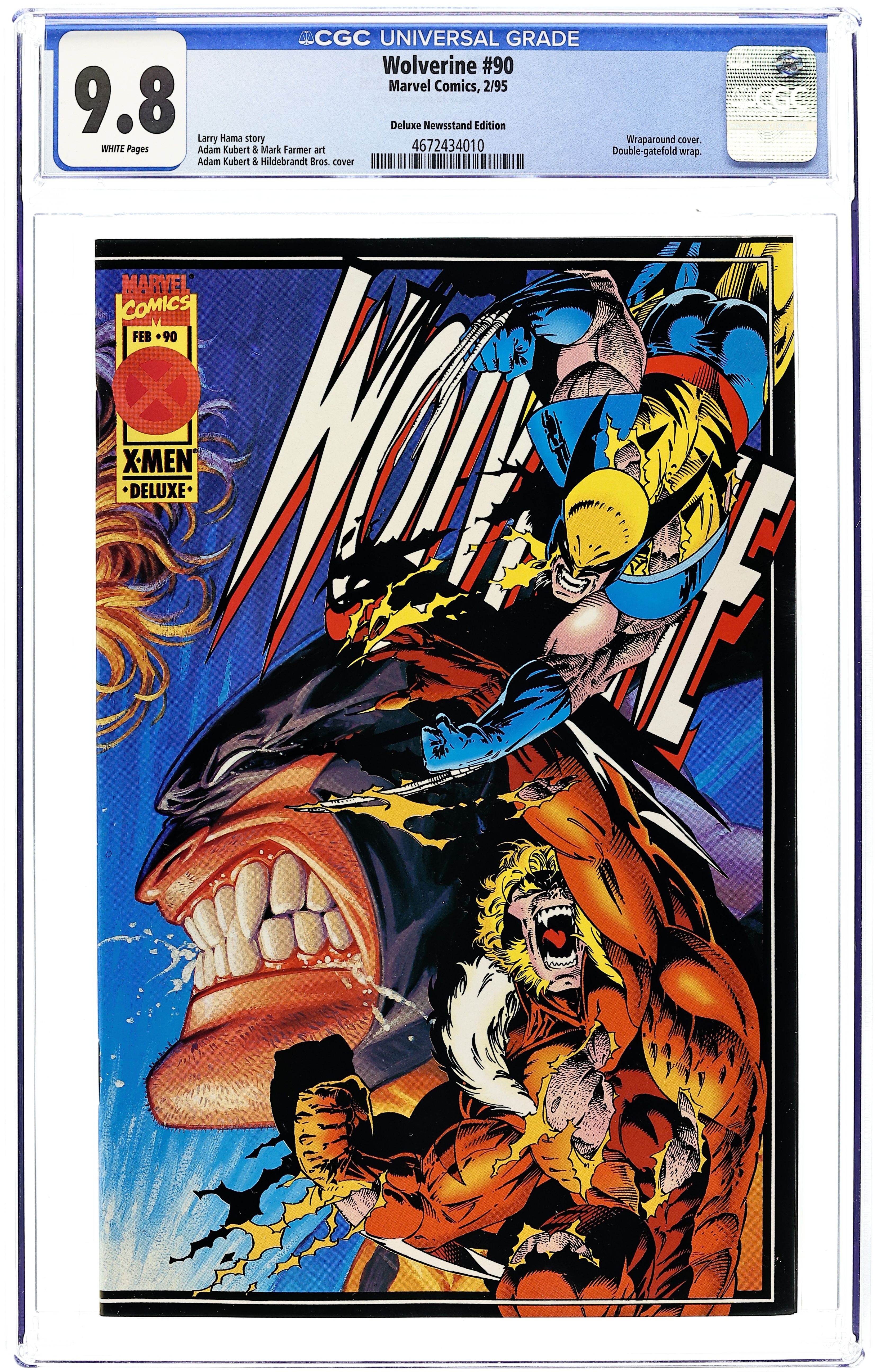 Deluxe Newsstand Edition. The Fleer X-Men cards have been REMOVED. Wraparound cover art by Adam Kubert (pencils), Tim Hildebrant (painted art), and Greg Hildebrant (painted art). The Dying Game, script by Larry Hama, pencils by Adam Kubert, inks by Mark Farmer and Dan Green; Wolvie and Sabretooth have a battle royale, and Wolvie ends up popping a claw through Sabretooth's brain. Next issue in story is Weapon X #1. This special issue includes TWO double-gatefold sections! 36 pgs. $1.95. Cover price $1.95.