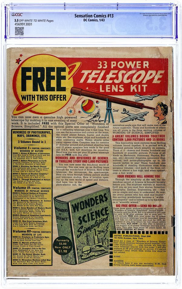 Cover art by Harry G. Peter. Wonder Woman Is Dead!, script by William Moulton Marston [as Charles Moulton], art by Harry G. Peter; Wonder Woman's magic lasso is stolen and used against her. Black Pirate and Son story, art by Sheldon Moldoff. Gay Ghost story, art by Howard Purcell. Guardian of the Peace starring Mr. Terrific, script by Ted Udall, pencils by Hal Sharp, inks by Chuck Winter. Little Boy Blue story, art by Jon L. Blummer Wildcat story, art by Irwin Hasen. 68 pgs. $0.10. Cover price $0.10.