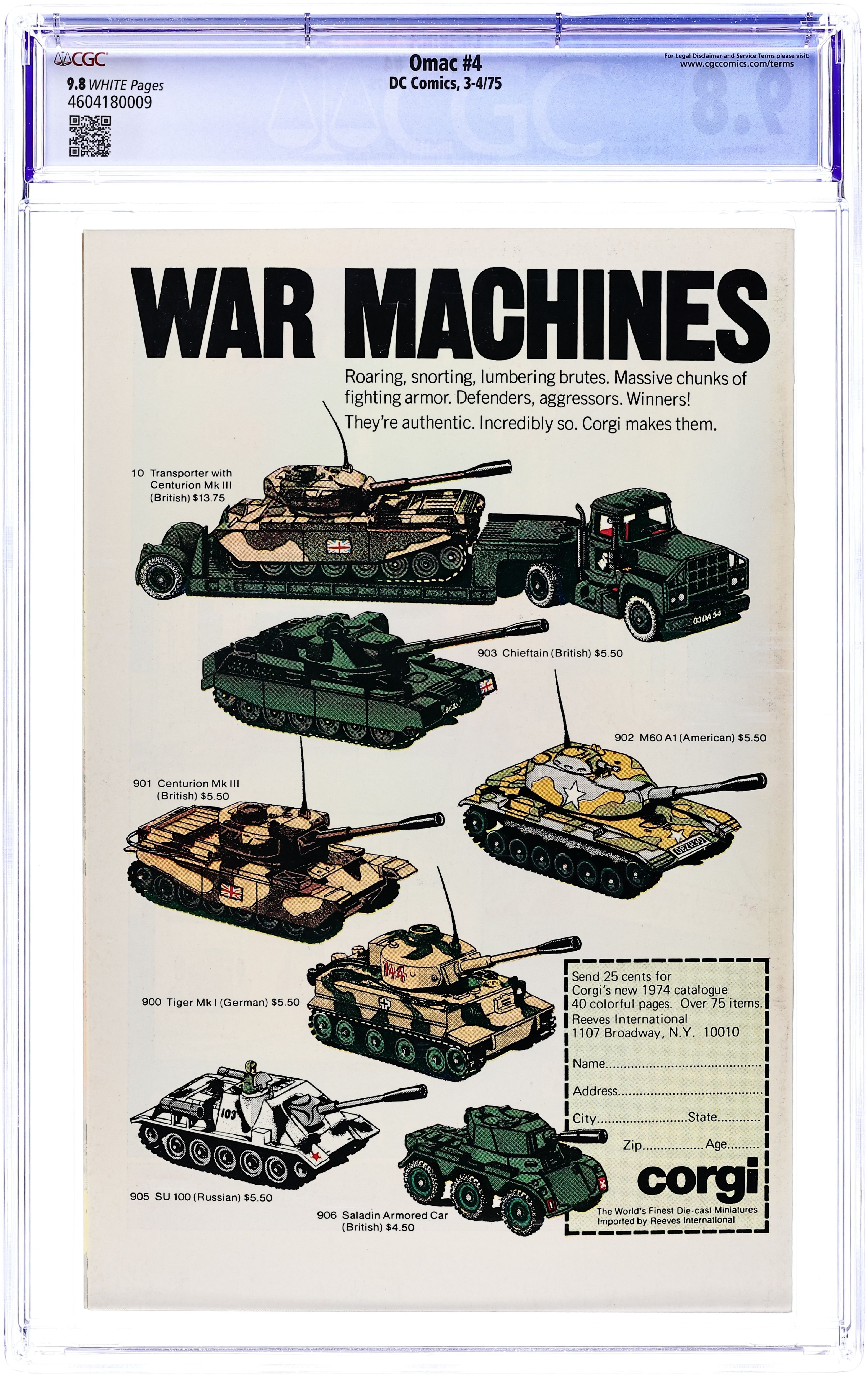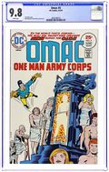 1st appearance and origin of Omac by Jack Kirby in the story, "Brother Eye and Buddy Blank." A transmission from the orbiting Brother Eye turns factory worker Buddy Blank into Omac, the One Man Army Corps. Script and pencils by Jack Kirby, inks by Mike Royer. Cover by Kirby and Royer. Cover price $0.20.