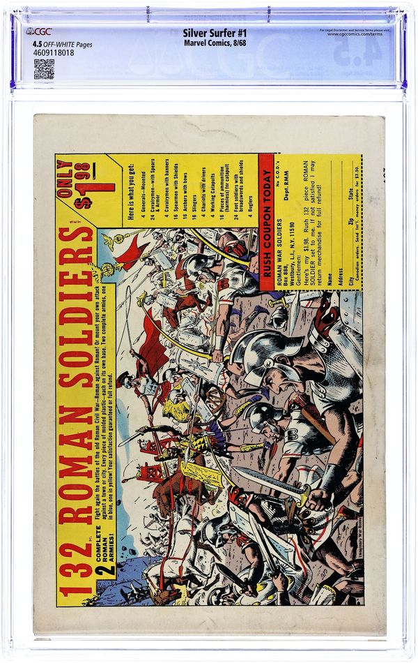 Cover pencils by Jack Kirby, inks by Joe Sinnott. Galactus battles the Silver Surfer in the conclusion of the Galactus Trilogy, The Startling Saga of the Silver Surfer!, script by Stan Lee, pencils by Jack Kirby, inks by Joe Sinnott; With the aid of the Silver Surfer, the Fantastic Four force Galactus to leave Earth; Johnny Storm begins to attend Metro College and meets Wyatt Wingfoot. Watcher and Inhumans appearances. First appearance of Wyatt Wingfoot. Letter to the editor from comics writer Gerry Conway. 36 pgs. $0.12. Cover price $0.12.
