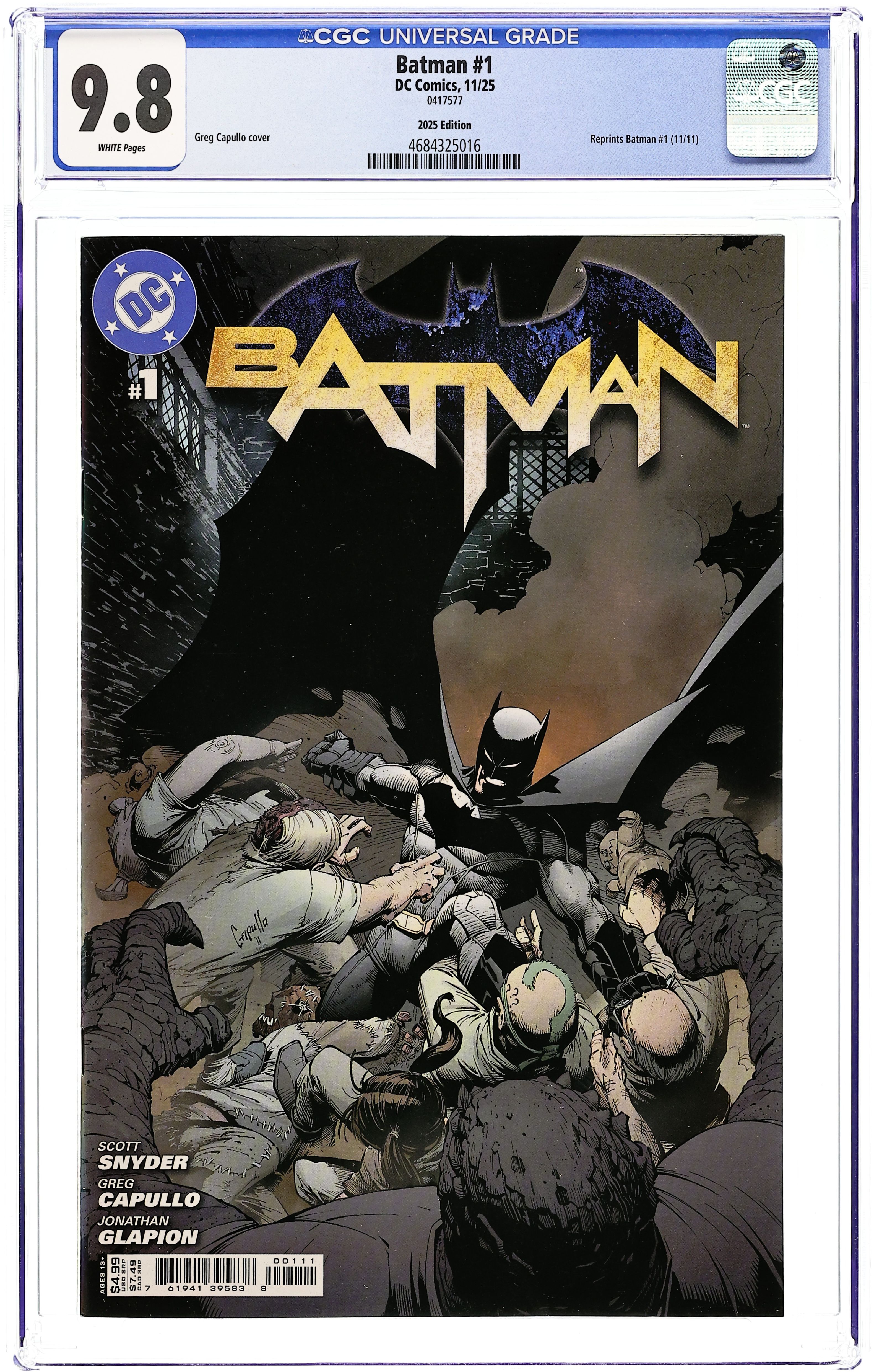 Dollar Tree/Circle K 2025 Reprint Edition. Reprints Cover and Material from Batman (2011 2nd Series) #1. Cover by GREG CAPULLO Written by SCOTT SNYDER Art by GREG CAPULLO and JONATHAN GLAPION Be here for the start of a new era for The Dark Knight from writer Scott Snyder (AMERICAN VAMPIRE, BATMAN: GATES OF GOTHAM) and artist Greg Capullo (Spawn)! A series of brutal killings hints at an ancient conspiracy, and Batman learns that Gotham City is deadlier than he knew. First appearance of Harper Row (cameo, not named in issue). Cover price $4.99.