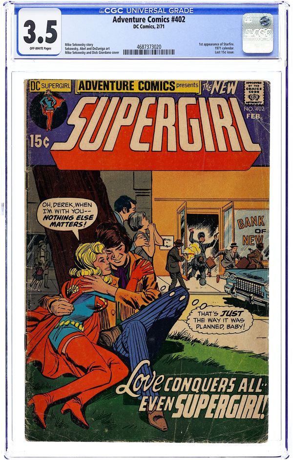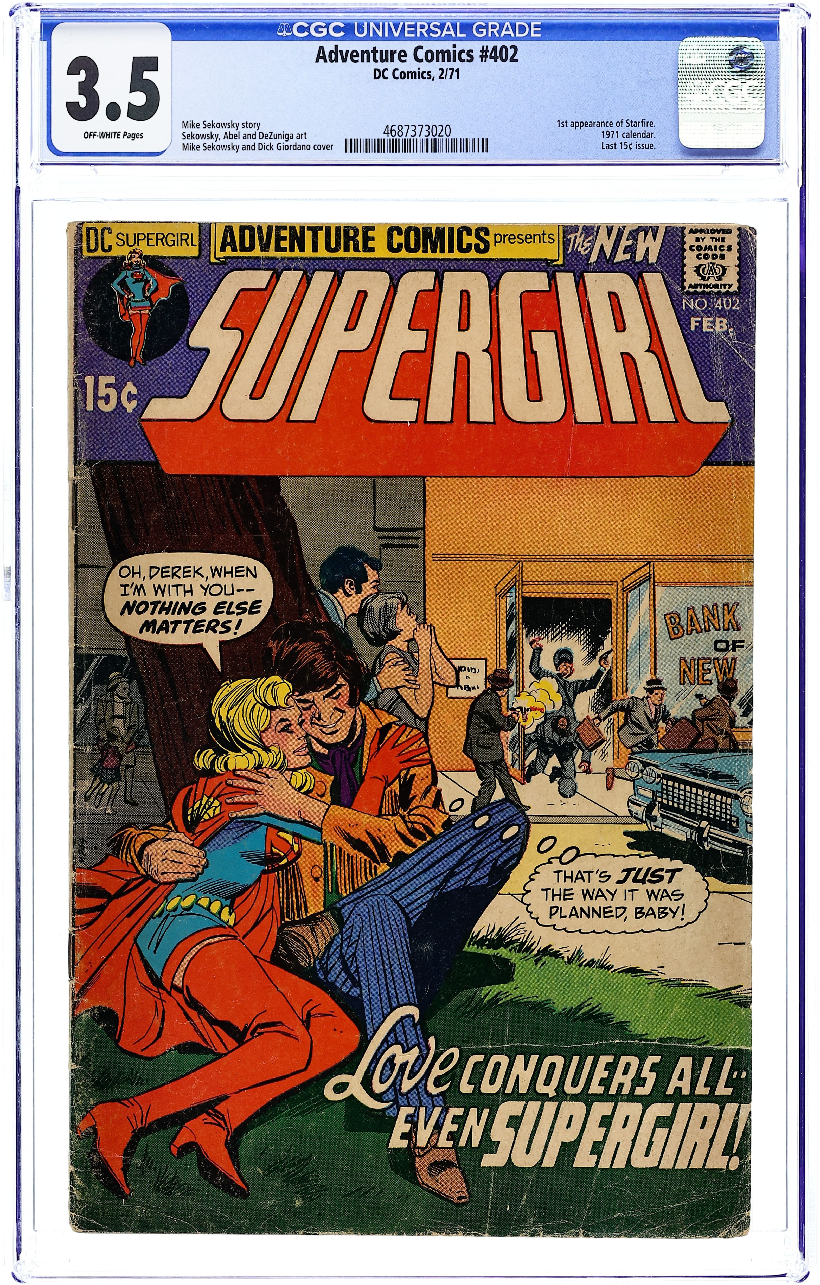 Cover pencils by Mike Sekowsky, inks by Dick Giordano. Starfire's Revenge! starring Supergirl, Starfire, Rodney Ames, Derek Ames, and Professor Kangle, script and pencils by Mike Sekowsky, inks by Dick Giordano; Supergirl battles Starfire. A letter to the editor from Bob Rozakis. 36 Pages, Full Color. Cover price $0.15.