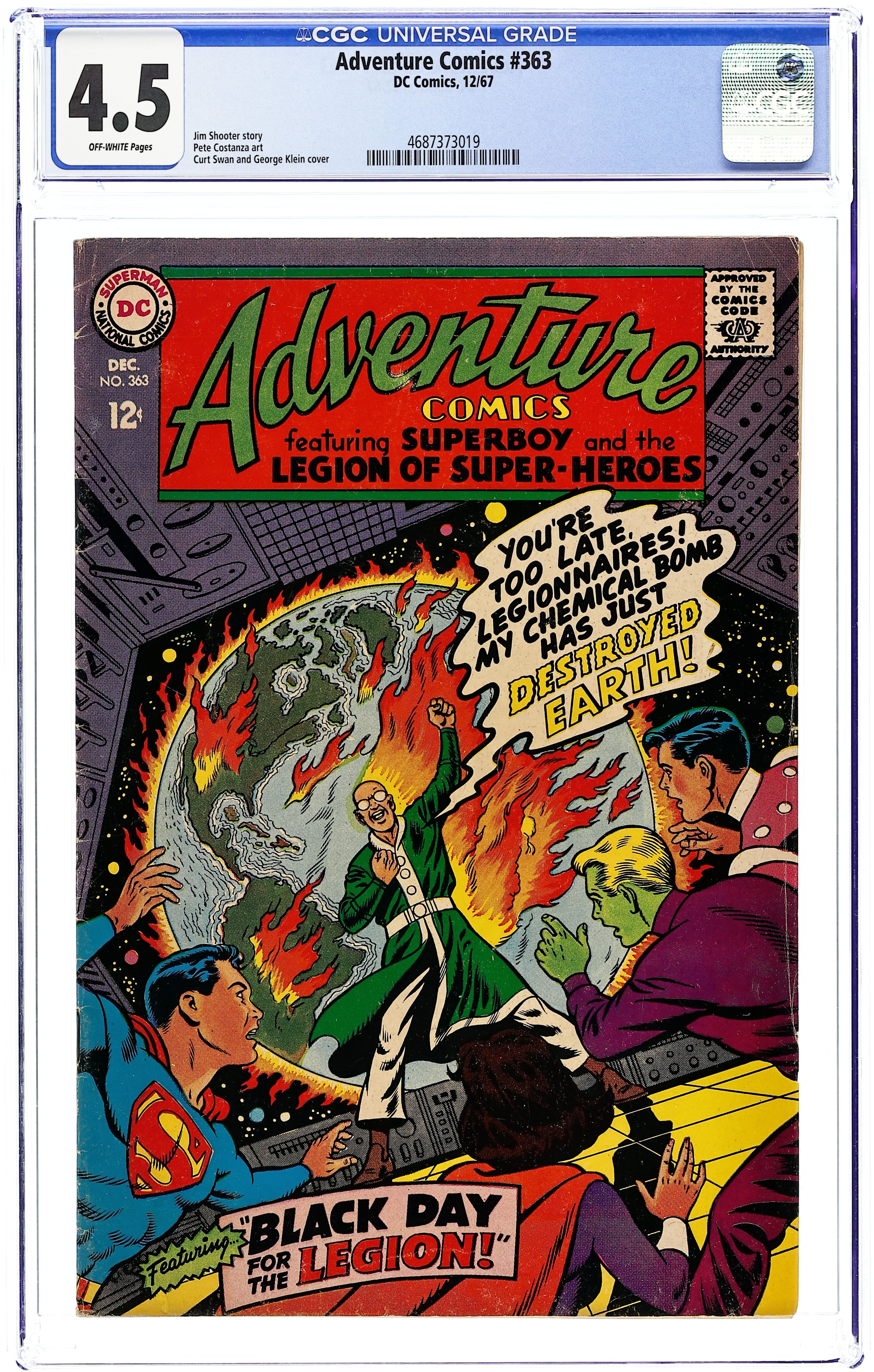 Cover pencils by Curt Swan, inks by George Klein. Black Day for the Legion!--Tales of the Legion of Super-Heroes, script by Jim Shooter, pencils by Jim Shooter (layouts only) and Pete Costanza, inks by Pete Costanza; Morlo escapes the Legion team on Orando, while at the same time a second Morlo encounters and escapes the team on Daxam; The Legionnaires on Naltor encounter a third Morlo, but all three were decoys meant to distract the Legion from Morlo's real plot to blow up Earth. Super-Turtle humor page by Henry Boltinoff. 36 Pages, Full Color. Cover price $0.12.