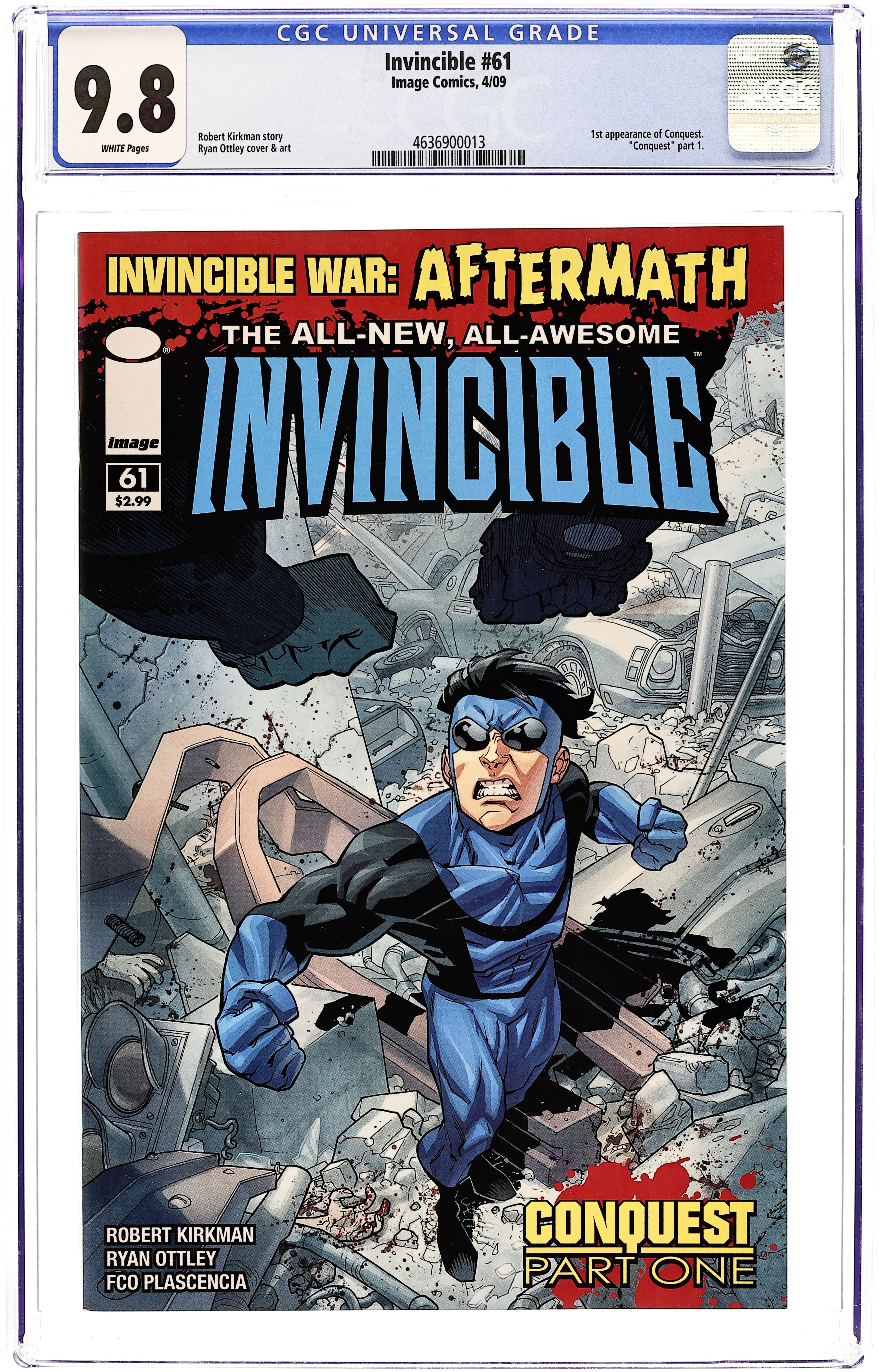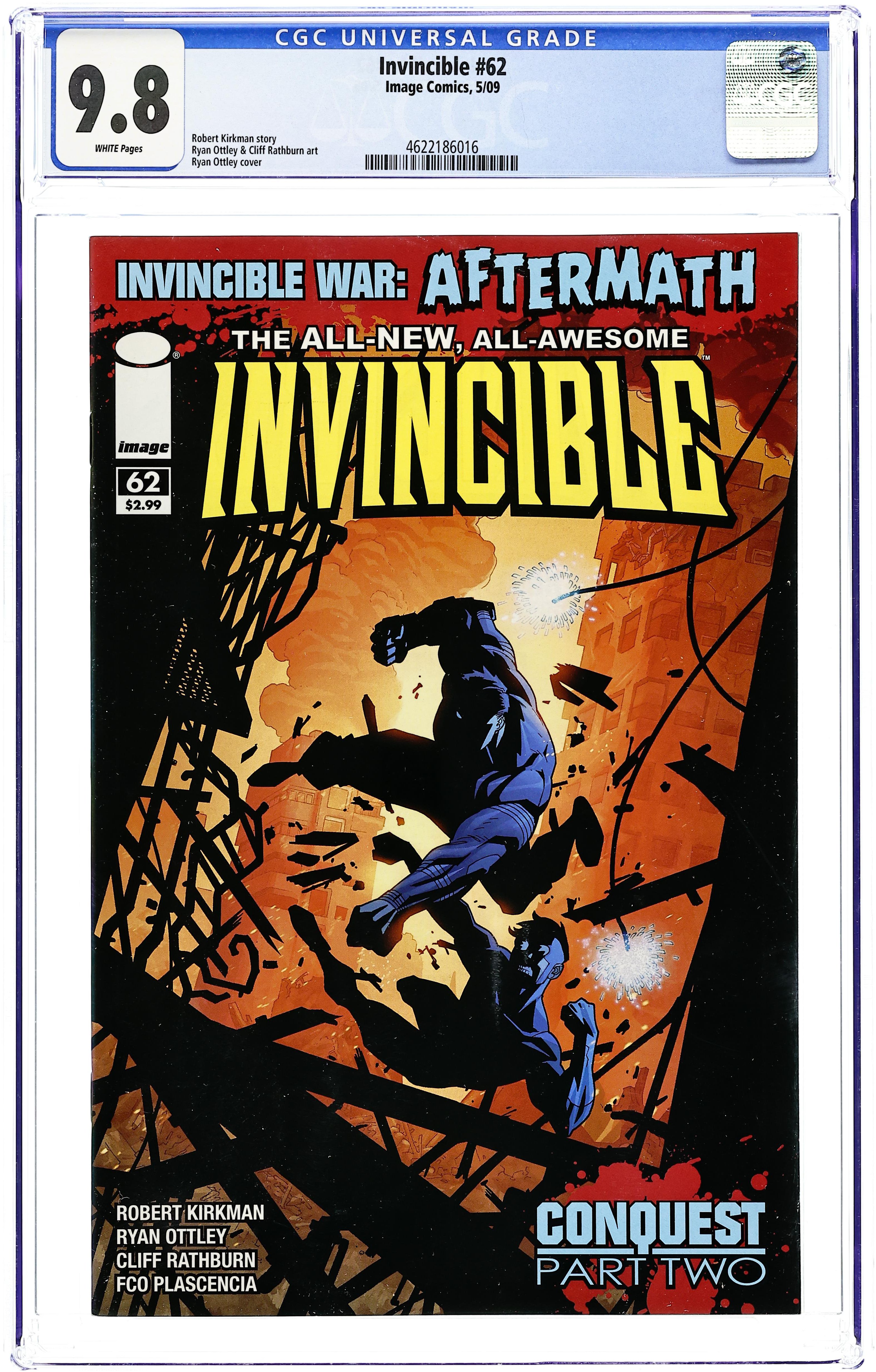 Written by ROBERT KIRKMAN. Art and Cover by RYAN OTTLEY and FCO PLASCENCIA. INVINCIBLE WAR: AFTERMATH! CONQUEST is here. Invincible is confronted with the most dangerous threat he's ever faced. He will not come out of this unscathed. This issue is not to be missed. 32 pages, full color. Cover price $2.99.