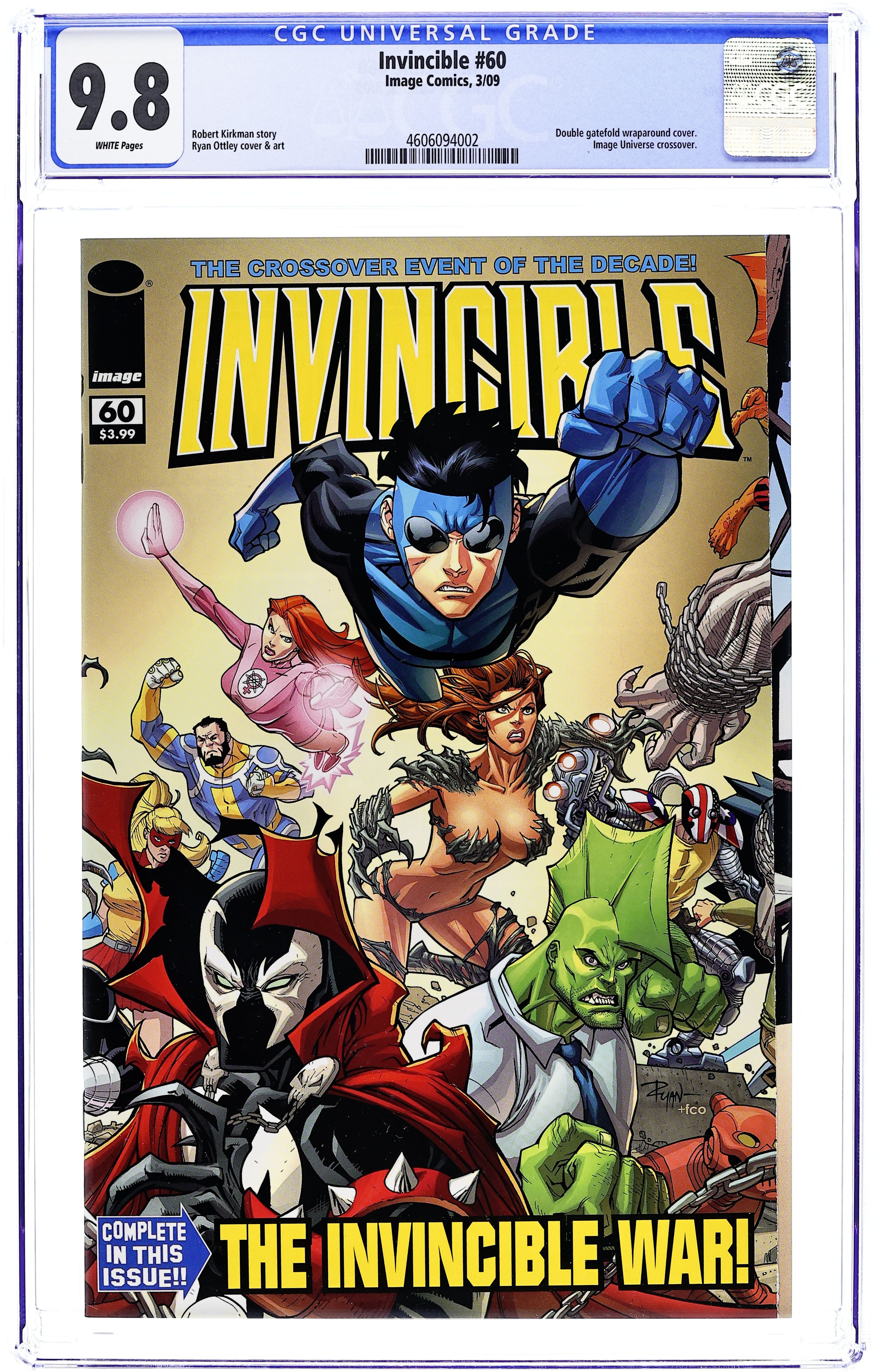 First Printing, Gatefold Wraparound Cover by Ryan Ottley & FCO Plascencia. by Robert Kirkman and Ryan Ottley & FCO Plascencia. From Image Comics. The Crossover Event of the Decade! Invincible is drawn into a company-wide crossover event done in one oversized issue! Spawn! Savage dragon! Youngblood! Shadowhawk! Cyberforce! Pitt! Ultra! and many, many more all here for one issue - don't miss it! 40 pages, FC. Cover price $3.99.
