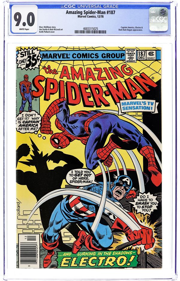 "The Power of Electro!" Guest-starring Captain America. Plot by Marv Wolfman and Jim Starlin. Script by Marv Wolfman. Brilliant art by Jim Starlin (layouts) and Bob McLeod (finishes). Cover by Keith Pollard. It's an overstuffed tale featuring the star-spangled avenger, web-slinger, SHIELD, Electro, and the bubonic plague! When the Daily Bugle receives a tip that authorities have cordoned off the neighborhoods surrounding the Indian Point Power Station, Jonah sends his ace photographer to investigate! The web-slinger easily slips past the SHIELD agents but runs into a problem after bumping into the Sentinel of Liberty! Cap wants the wall-crawler to leave the area ASAP! But Cap would think differently if he knew that an electrifying encounter awaits! The Amazing Spider-Man and Captain America vs. Electro! Cameo appearances by Dum Dum Dugan, J. Jonah Jameson, and Joe Robertson. (Notes: This is one of only three issues Jim Starlin drew for the Amazing Spider-Man title (1st series): issues 113, 114, and 187. More of Jim Starlin's artwork featuring Spider-Man can be seen in Marvel Two-in-One Annual 2. The web-slinger and Electro previously battled in Marvel Team-Up 56.) 36 pages Cover price $0.35.