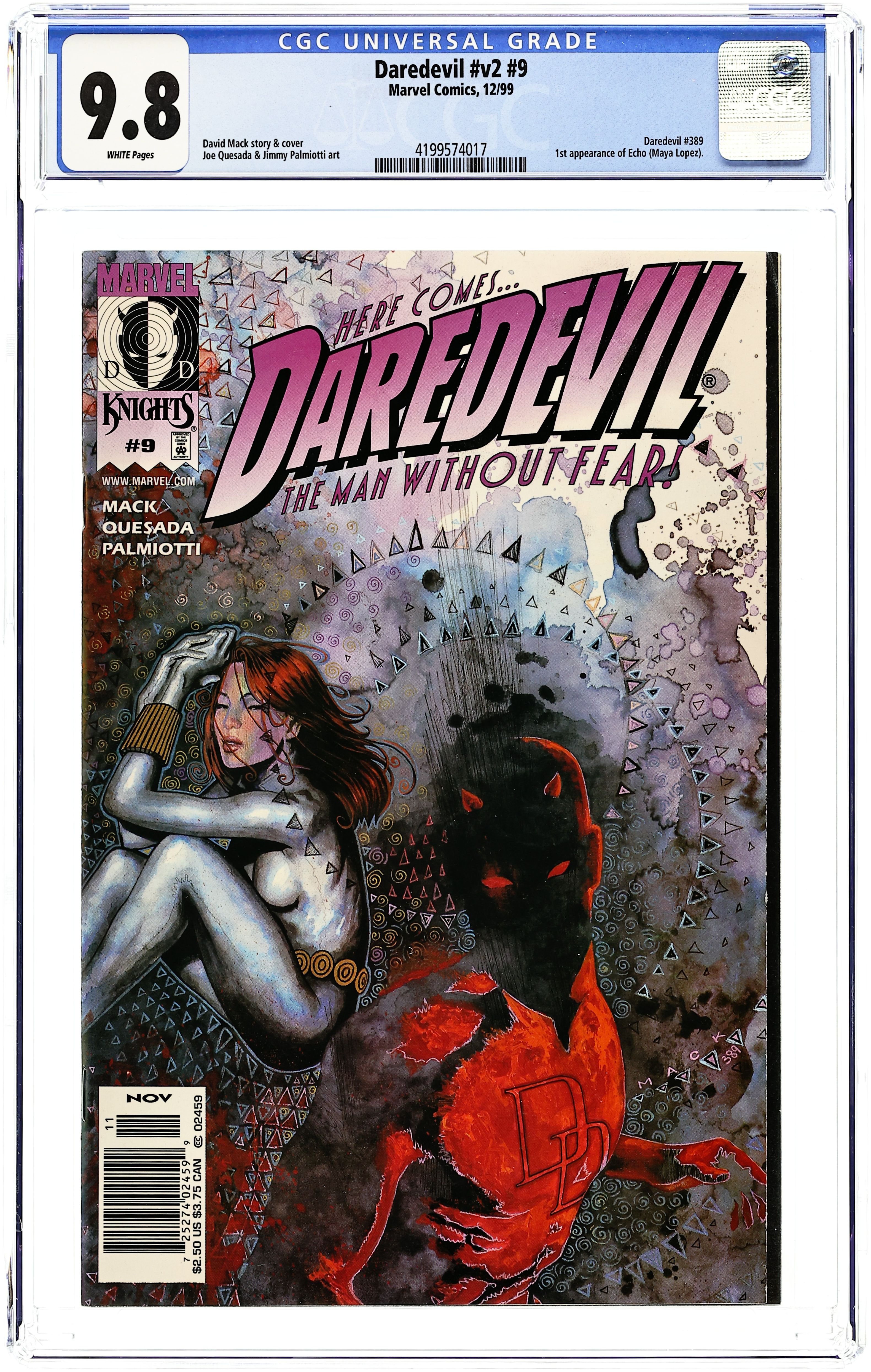 cover by quesada, PALMIOTTI & mack david mack/joe quesada/jimmy palmiotti Introducing Echo, a new villain so strange you'll swear you're hearing her name over and oer and over and...! Matt Murdock gets slapped upside the head by Cupid as a new romantic interest enters his still shattered life. But is she the lady of his dreams or a nightmare waiting to happen? Plus: Daredevil uncovers a deep dark secret thatcould destroy the Kingpin! "Quesada's art is simply gorgeous. A classic in the making and the best mainstream comic around at the moment, bar none. Score: 10 (out of 10)" -Comics International " Cover price $2.50.