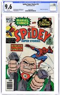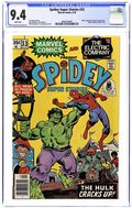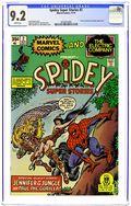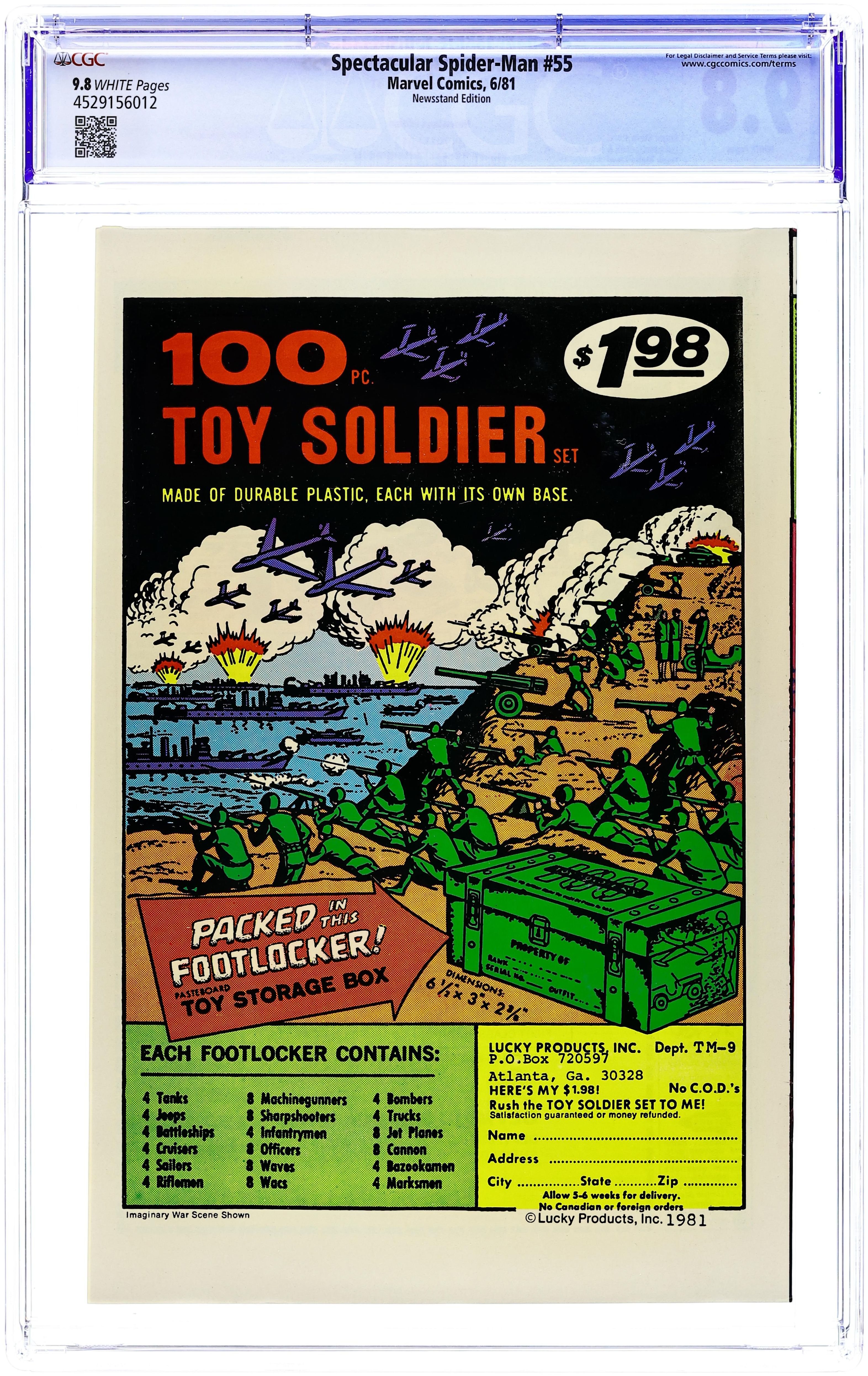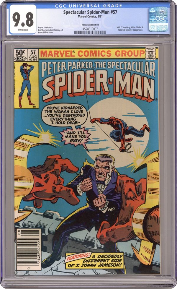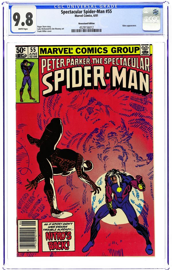 Newsstand Edition. "The Big Blow Out" Script by Roger Stern. Pencils by Luke McDonnell. Inks by Jim Mooney. Cover by Frank Miller. Thanks to a legal technicality, one of Captain Marvel's deadliest foes is released from Project Pegasus. And now the Spectacular Spider-Man has an explosive problem on his hands...Nitro! Neither hero nor villain knows much about the other's powers, but that doesn't prevent the pair from waging a terrific battle across Manhattan! (Note: Nitro previously appeared in Omega the Unknown 8.) 32 pages Cover price $0.50.