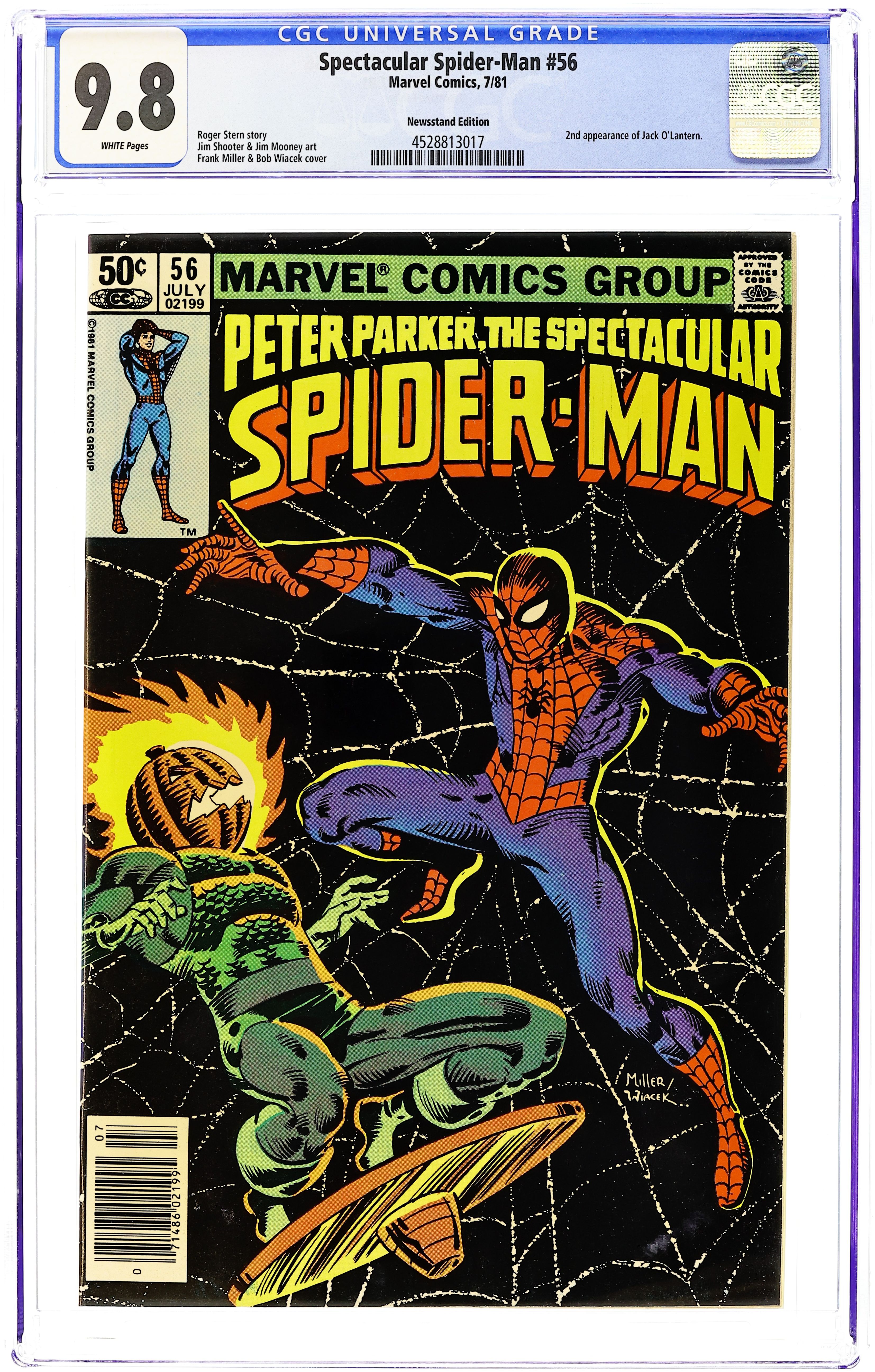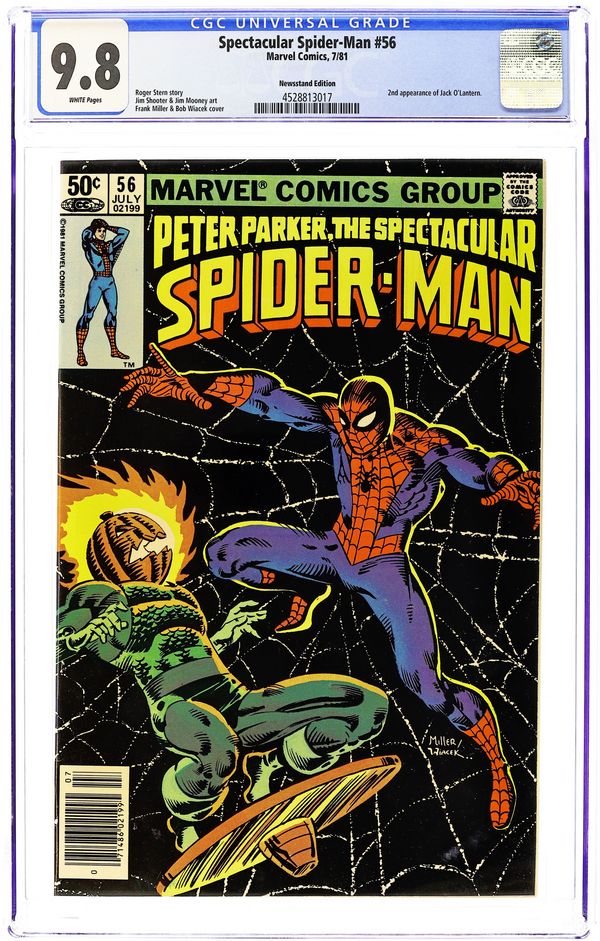 Newsstand Edition. "The Peril...and the Pumpkin?" Script by Roger Stern. Art by Jim Shooter (layouts) and Jim Mooney (finishes). Cover by Frank Miller and Bob Wiacek. Second appearance of Jack O'Lantern (aka Jason Macendale). The evil terrorist, Jack O'Lantern, has taken the staff and patients at Bellevue Hospital hostage! And the hostage list includes Aunt May's fiancé, Nathan Lubensky! However, the wondrous wall-crawler is on the way; and Jack O'Lantern will soon be on the run! Meanwhile at Empire State University, Steve Hopkins' prank on Marcy Kane goes terribly wrong. Cameo appearances by Nitro and the Vulture. (Notes: Jack O'Lantern first appeared in Machine Man 19. Jason Macendale eventually became the Hobgoblin in Amazing Spider-Man 289. This issue includes a full-page ad for Marvel Treasury Edition 28 "Superman and Spider-Man.") 32 pages Cover price $0.50.
