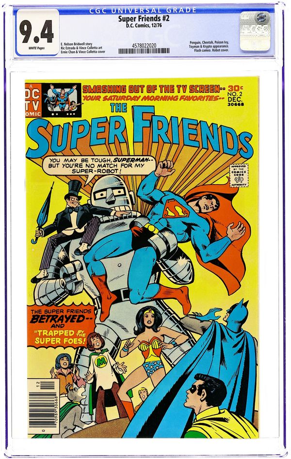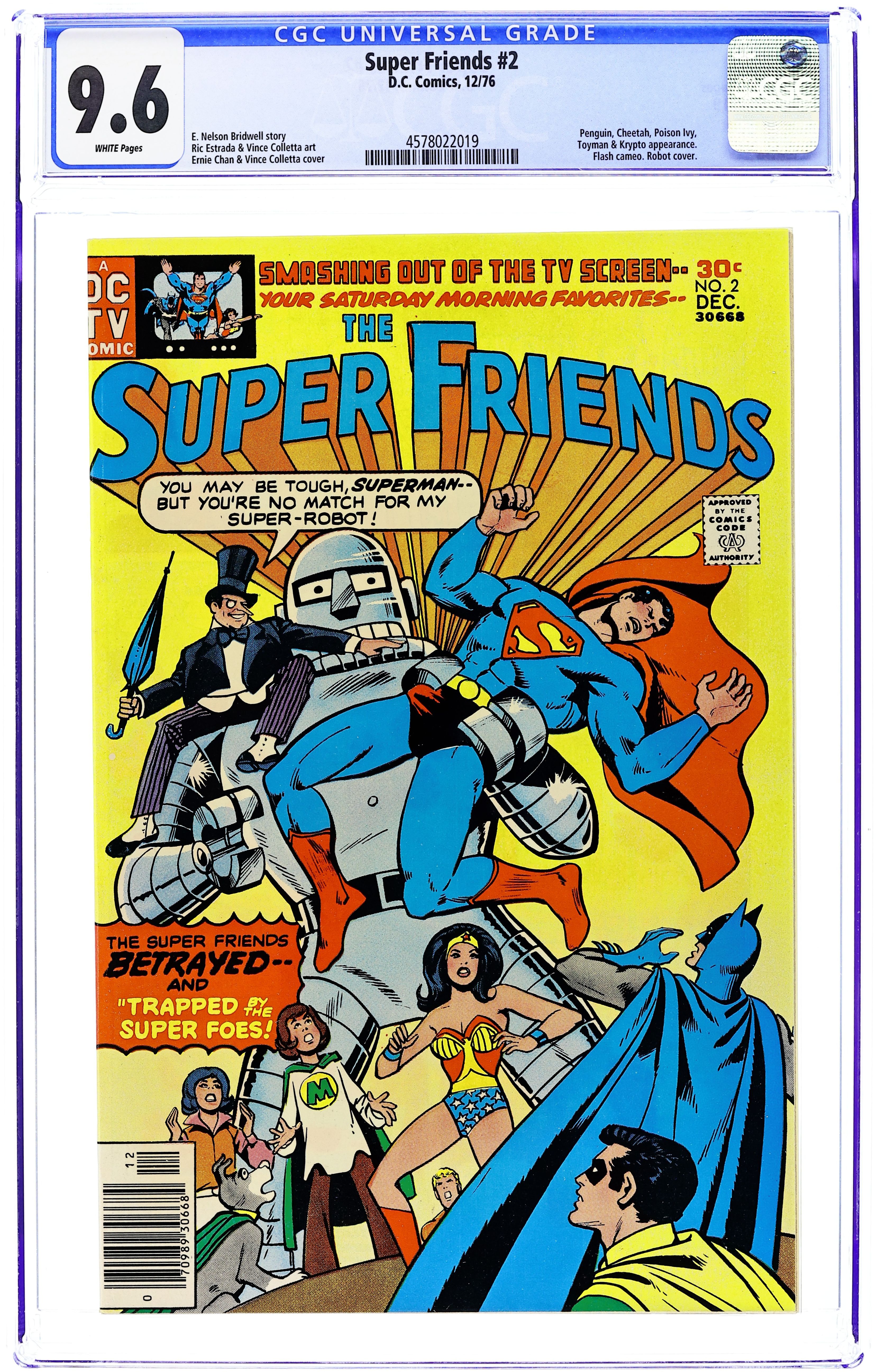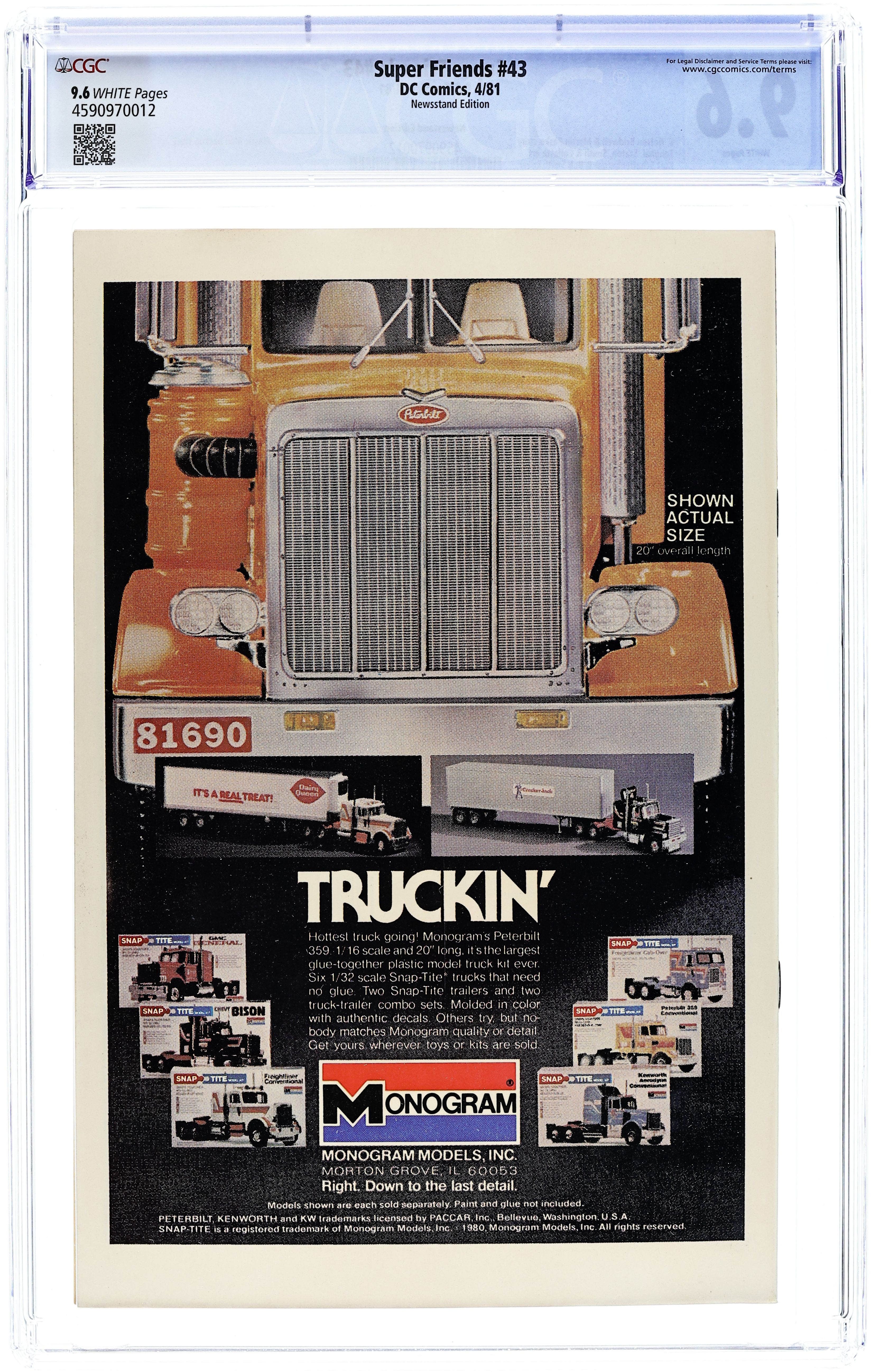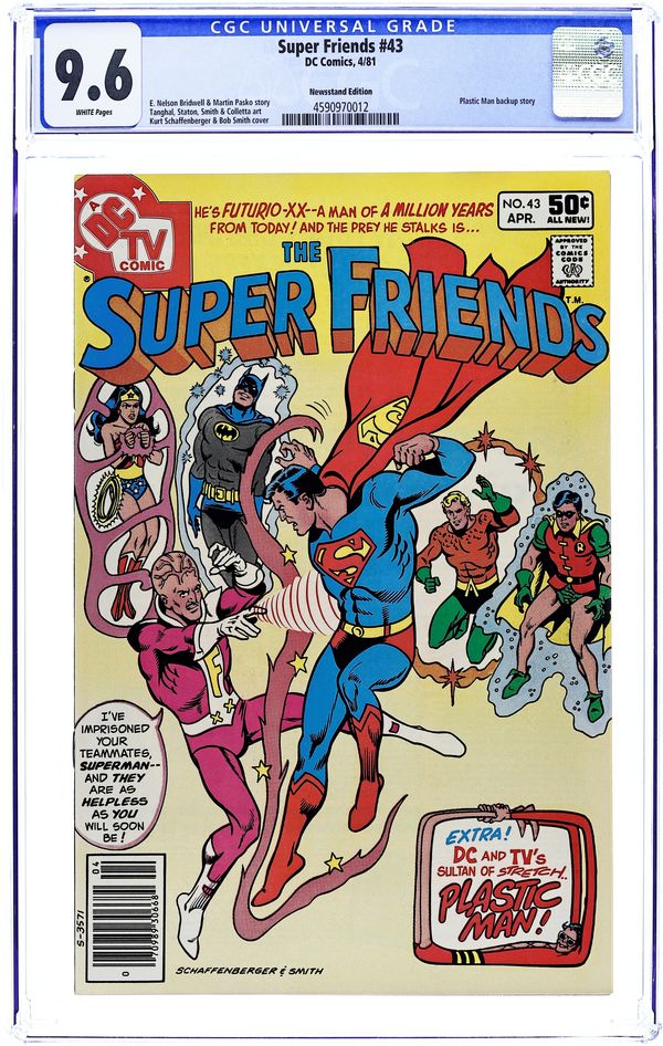 Newsstand Edition. "Futurio Times Ten." Futurio-XX, the Overlord's futuristic clone, wants a clone of Wonder Woman as a mate, but can't bring himself to kill the Super Friends. Starring Aquaman, Batman, Robin, Superman, Wonder Woman, Zan, and Jayna. Script by E. Nelson Bridwell, pencils by Romeo Tanghal, inks by Vince Colletta. Cover by Kurt Schaffenberger and Bob Smith. Cover price $0.50.