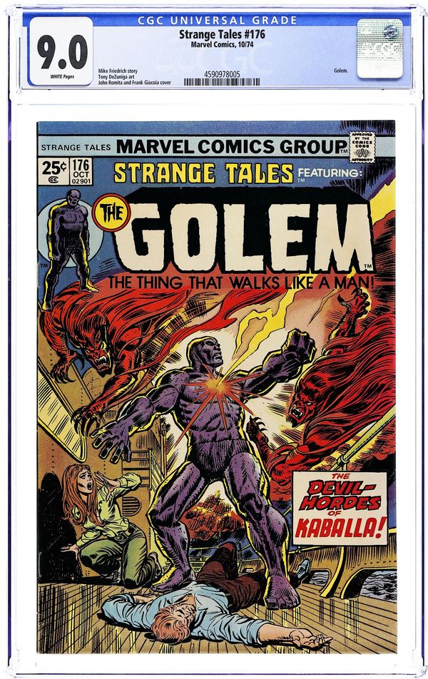 Cover art by John Romita. "Black Crossing," script by Mike Friedrich, art by Tony DeZuniga (not Luis Dominguez); Having just been saved by the Golem from a rebel army, Wayne Logan and Jason and Rebecca Adamson are shocked at the creatures lethal methods; As the statue becomes inert again, they theorize how Rebecca's recently deceased grandfather Abraham Adamson, managed to revive the creature; the Golem becomes a subject of interest for a sorcerer named Kaballa, who wishes to destroy the it. Reprint of an old weird story, "The Man Who Couldn't Be Killed!" (from Adventure Into Mystery 8), art by Jimmy Infantino; A man is going to be hanged on Monday so he escapes from jail and gets a potion from a witch doctor that will remove all Mondays from his life. The letters page contains Marvel Value Stamp series A #94 (Electro by Steve Ditko). 36 pgs., full color. Cover price $0.25.