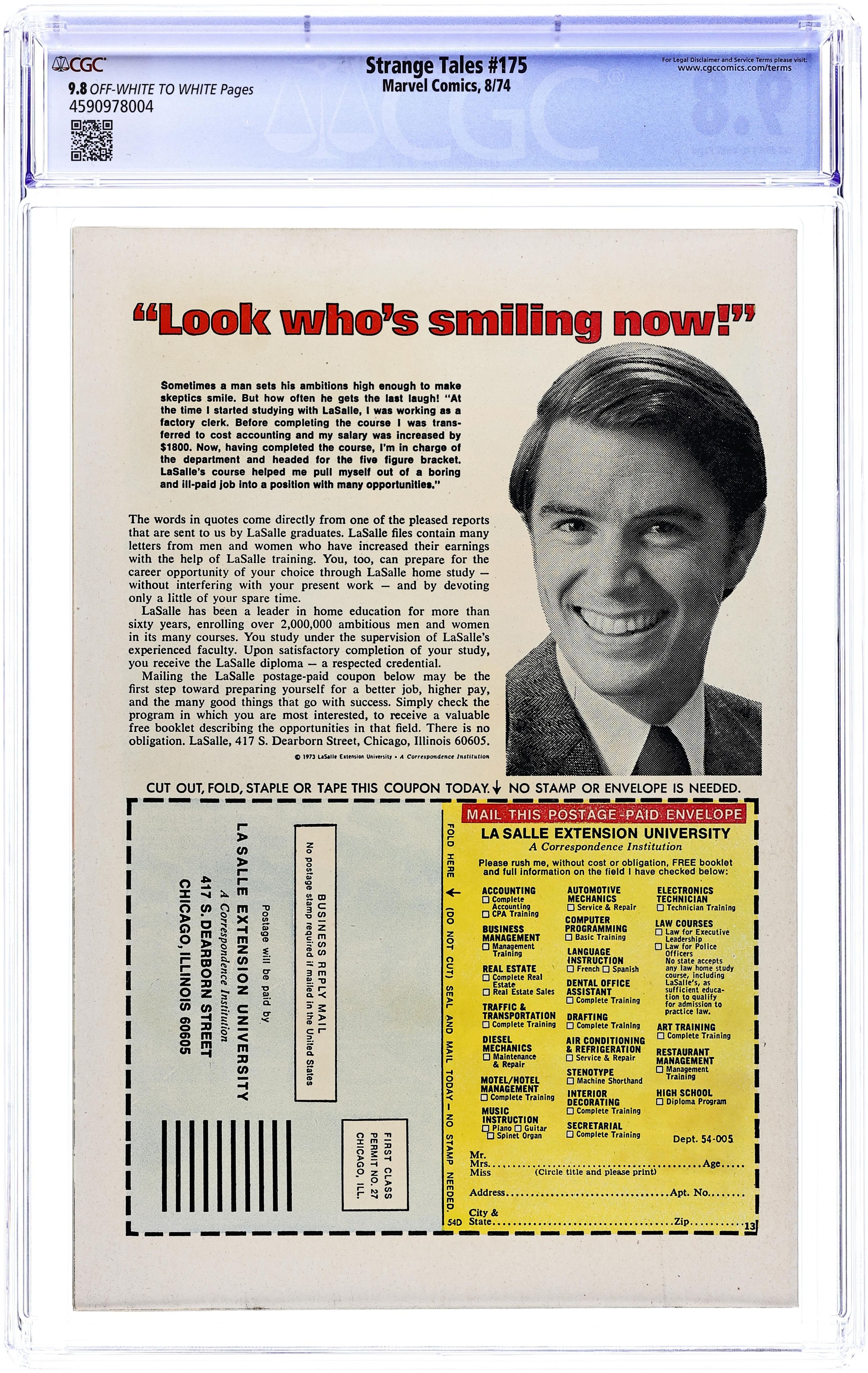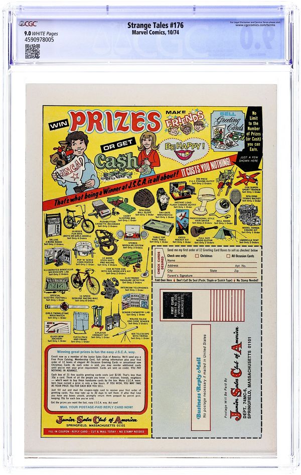 Cover art by Jim Starlin. "The Judgment!", script by Jim Starlin (as Sam Jiltirn), pencils by Jim Starlin, inks by Jim Starlin (as J.L. Minirats) and Alan Weiss; While battling a couple of the Black Knights the Soul Gem almost takes control again and Warlock decides, that he must destroy it, however as he takes it off Warlock collapses and realizes, that he can no longer exist without the Gem as it has been sucking out Warlock's Soul in the last three Years thus becoming his life force; The Matriarch wants to make a Slave out of Warlock now instead of killing him; After trying to remove the Gem Warlock is invited by the Matriarch to the Sacred Palace, an obvious trap, but since she claims, that she knew that the gem would become a danger even to Warlock himself, Warlock decides to accept the invitation and ditches; Pip First appearance of Gamora. Spider-Man stars in a one-page Hostess ad, "The Trap." 36 pgs., full color. Cover price $0.25.
