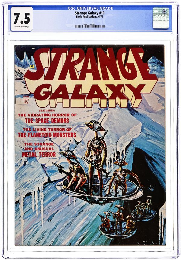 Cover by Johnny Bruck. Stories and art by Hector Castellon, Tono Gallo, Oscar Stepancich, John Martin Leahy and Ezra Jackson. Legendary publisher Eerie presents tales of science fiction and horror, many "reanimated" from classic pre-Code horror comics with new art. Stranded on Mars, astronaut Bob encounters a giant living hand with eyes. Robots run amuck on a space colony, and the humans seek an answer. Space explorers meet a strange girl living with a race of tiny, monkey-like beings. Painted cover by Johnny Bruck is reprinted from Germany's Perry Rhodan. Space Demon; Metal Terror; Antarctic Horror; Planetoid Monsters; Druids Castle; The Corpse Who Killed; Secret Coffin. 8 1/2-in. x 11-in. 48 pages, B&W. Mature readers. Cover price $0.50.