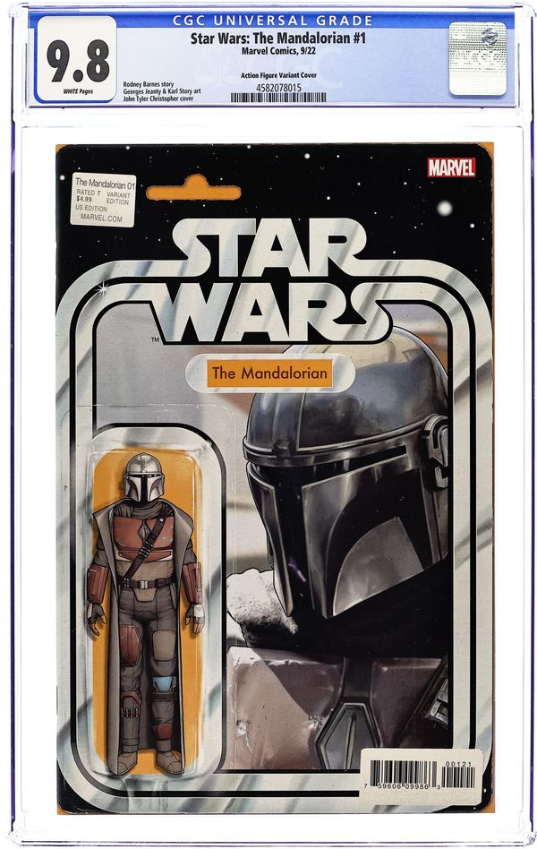 Written by Rodney Barnes. Art by Georges Jeanty. Cover by John Tyler Christopher. For the first time, THE MANDALORIAN arrives in comics! The Mandalorian bounty hunter tracks a target for a well-paying, mysterious client. Witness the introduction of Din Djarin and the first meeting between the Mandalorian and the Child! 40 pages, full color. Rated T Cover price $4.99.