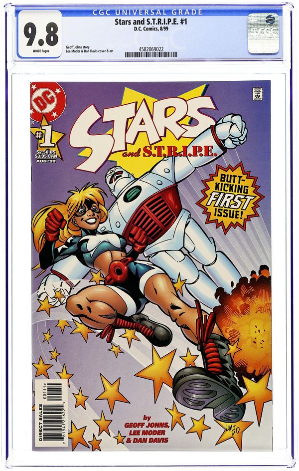 WRITTEN BY GEOFF JOHNS; ART AND COVER BY LEE MODER AND DAN DAVIS. You've seen her in issue #0, you'll be seeing her in JSA #1, but here it is: the origin and first adventure of DC's newest Star! Freshly moved to Blue Valley (former home of Kid Flash!), Courtney Whitmore learns a secret about her new step-dad, Pat: he was once known as Stripesy, the Golden Age sidekick of the original Star-Spangled Kid! And what better way to irritate the new dad by forcing him to be a sidekick again... to her, as the new Star-Spangled Kid makes her action-packed debut at Blue Valley High? FC, 32 PG.$2.50" Cover price $2.50.