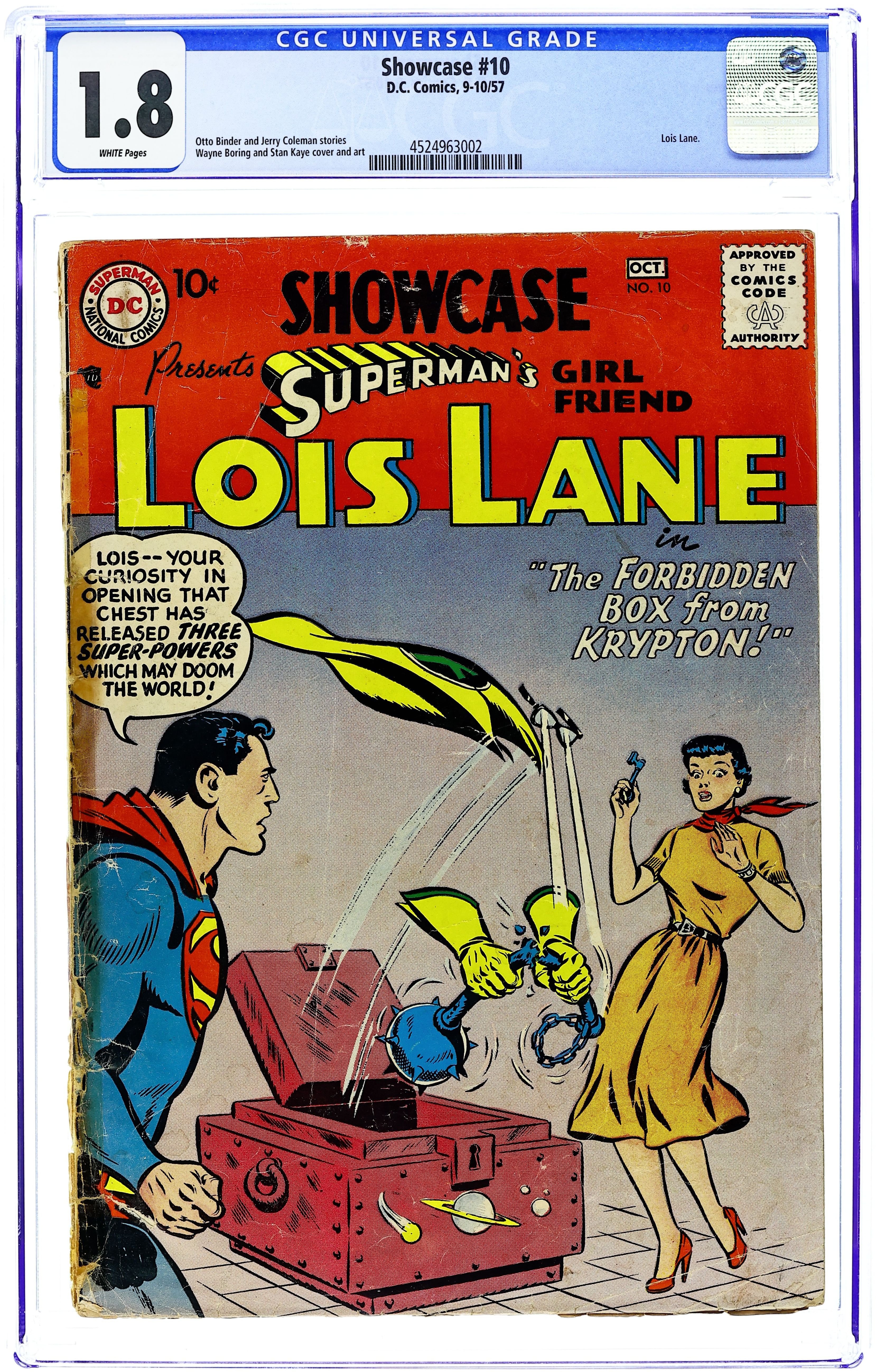 Cover pencils by Wayne Boring, inks by Stan Kaye. Lois Lane's 2nd and last appearance in Showcase (after this she gets her own title, Superman's Girlfriend, Lois Lane). The Jilting of Superman, script by Otto Binder, pencils by Wayne Boring, inks by Stan Kaye; Lois tries to make Superman jealous by pretending to be married to someone else. Danger: Prejudice at Work public service announcement, script by Jack Schiff, art by Ruben Moreira. The Sightless Lois Lane, script by Jerry Coleman, pencils by Wayne Boring, inks by Stan Kaye. The Forbidden Box from Krypton, script by Otto Binder, pencils by Wayne Boring, inks by Stan Kaye; Lois discovers a box of Kryptonian artifacts that give her super powers. 36 Pages, Full Color. Lois Lane's 2nd and last appearance in Showcase (after this she gets her own title!). Cover price $0.10.