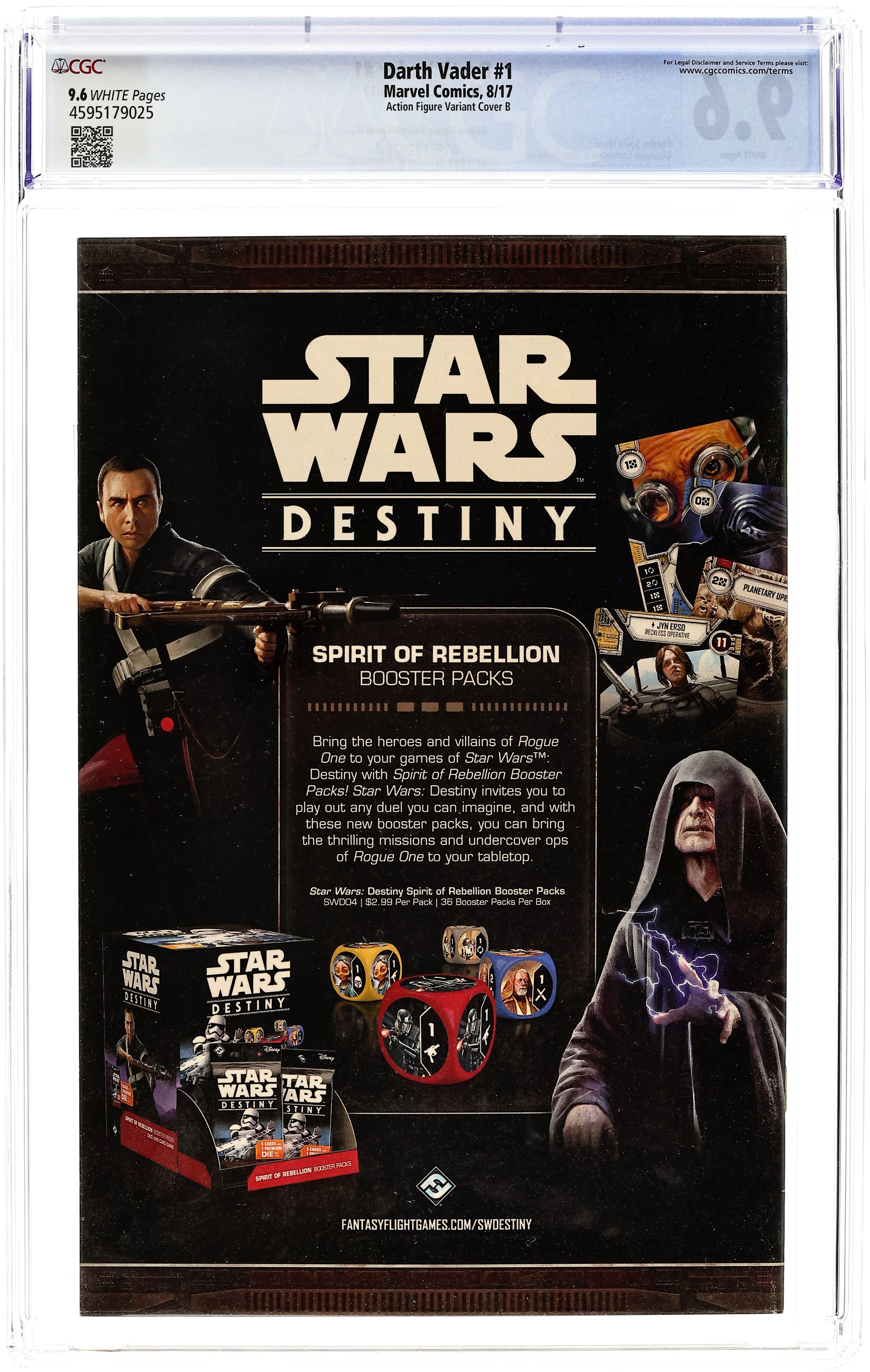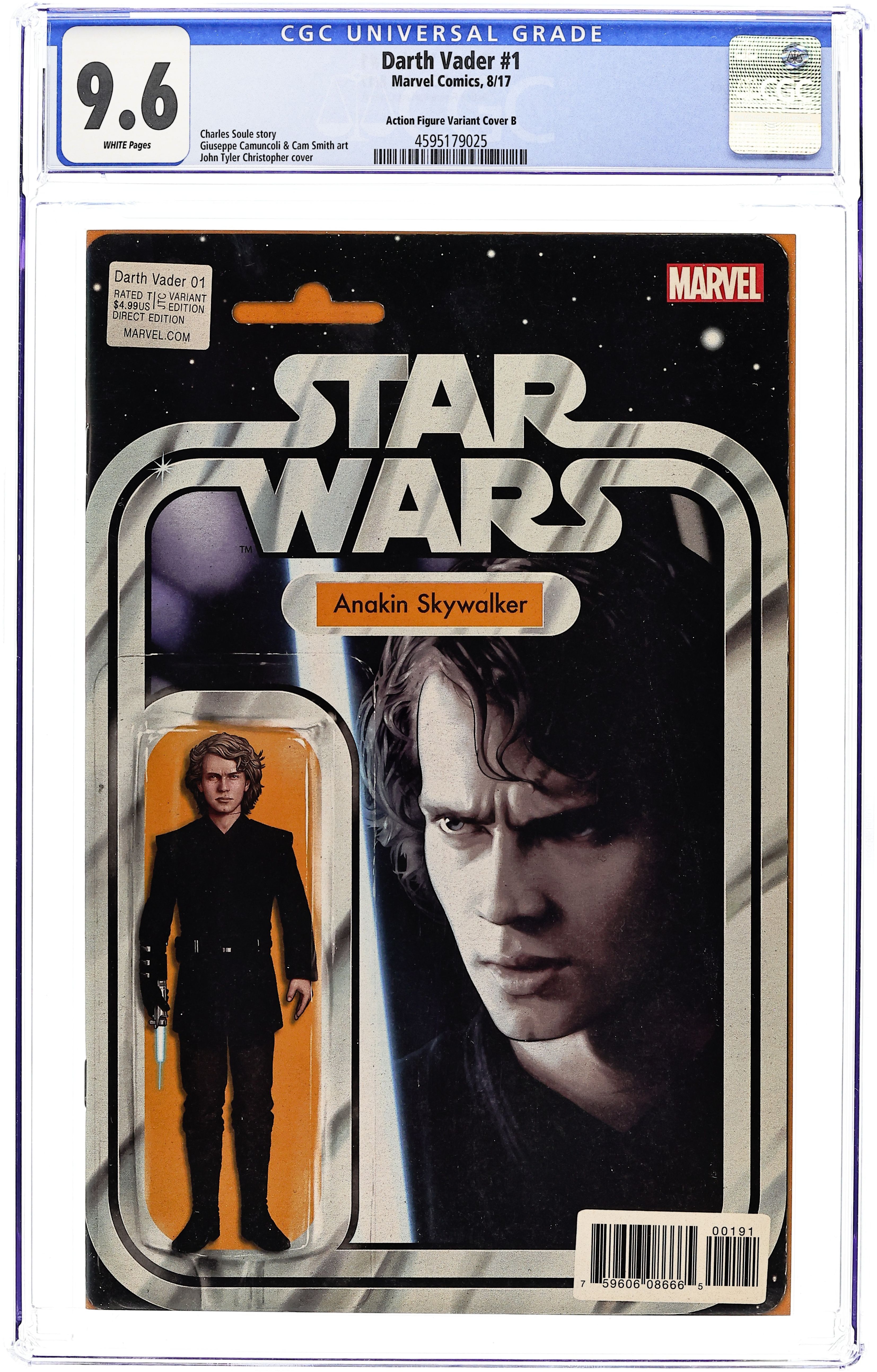 "Anakin Skywalker" Action Figure Variant Cover by John Tyler Christopher. Written by Charles Soule. Art by Giuseppe Camuncoli. Cover by Charles Soule. The most fearsome villain of all time returns with an all-new series! When Anakin Skywalker fell, both to the pull of the dark side and to the blade of Obi-Wan Kenobi, he rose back up, more machine than man. Having lost everything that was once dear to him, the former chosen one must take his first steps into a darker world…as Darth Vader, Dark Lord of the Sith! Join Vader as he learns a new way - the way of Darth Sidious and his newly formed Empire…the way of the dark side. 44 pages, full color. Rated T Cover price $4.99.