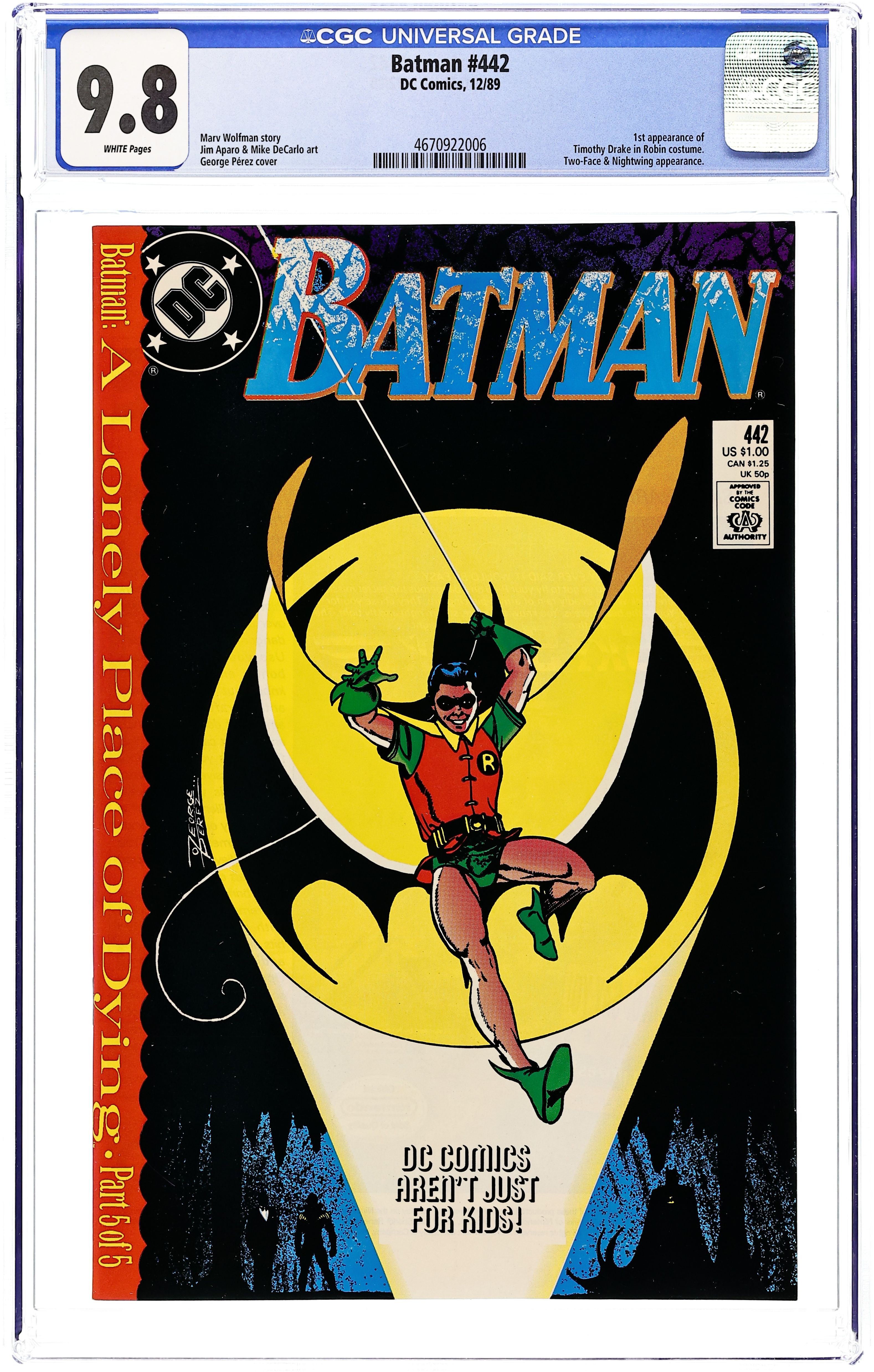 Direct Edition. Cover by George Perez. "A Lonely Place of Dying Chapter Five: Rebirth," script by George Perez (Co-Plot) and Marv Wolfman, pencils by Jim Aparo, inks by Mike DeCarlo; With Batman and Nightwing trapped by Two-Face, there's only one person left to save the day; Prepare for the debut of the newest Robin, Tim Drake! Columns on "Bat Questions Answered," "Continuity Corner," and "From the Den," the latter by Denny O'Neil. 36 Pages, Full Color. Cover price $1.00.