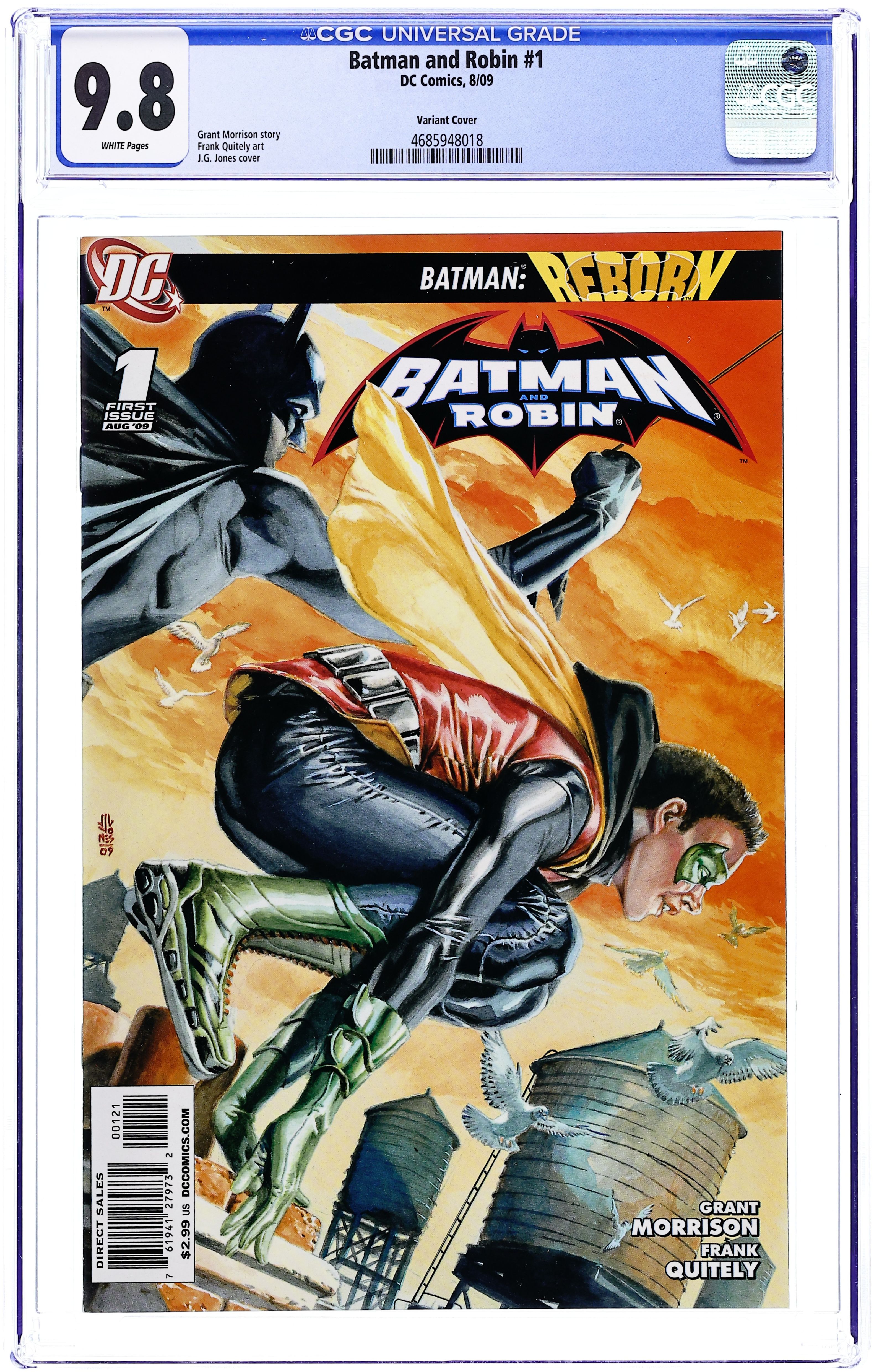 Limited Edition (1 for 25) Variant Cover by JG Jones. Batman Reborn: Part 1 of 3 - Written by Grant Morrison Art by Frank Quitely 'Batman Reborn' begins here! With the reunited team of Grant Morrison and Frank Quitely (ALL-STAR SUPERMAN, WE3, New X-Men), this first issue kicks off a 3-part story arc that can't be missed! The new Dynamic Duo hit the streets with a bang in their new flying Batmobile as they face off against an assemblage of villains called the Circus of Strange. They also tackle their first mission investigating a child who's been abducted by the mysterious Domino Killer. But will everything go smoothly? And who exactly are the new Batman and Robin? The newest era of The Dark Knight begins here! Retailers please note: This issue will ship with three covers. For every 25 copies of the Standard Edition (with a cover by Frank Quitely), retailers may order one copy of the Variant Edition (with a cover by JG Jones). For every 250 copies of the Standard Edition, retailers may order one copy of the Sketch Variant Edition (with a cover by Frank Quitely), which is a sketch version of the Standard Edition. Please see the Previews Order Form for more information. On sale June 3 ? 32 pg, FC, $2.99 US Cover price $2.99.