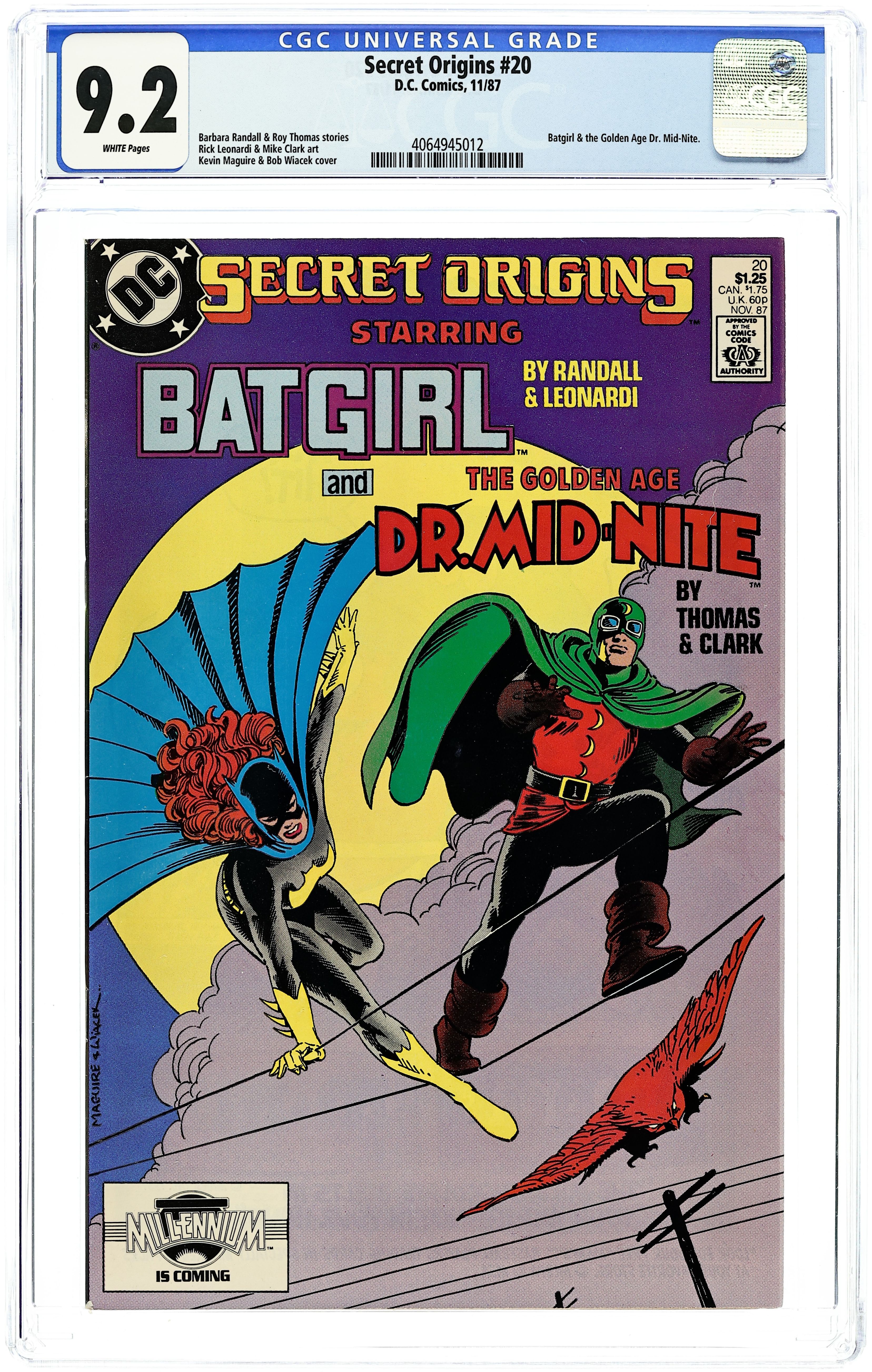 Cover pencils by Kevin Maguire, inks by Bob Wiacek. Flawed Gems, script by Barbara Randall, pencils by Rick Leonardi, inks by Dick Giordano; a new, post-Crisis origin of Batgirl. The Secret Origin of Dr Mid-Nite, script by Roy Thomas, pencils by Mike Clark, inks by Jerry Acerno. 52 pgs. $1.25. Cover price $1.25.