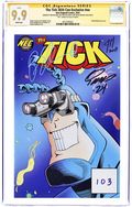 Baltimore Comic Con exclusive limited to 350 copies. Cover by Duane Redhead. In 1991, Ben Edlund and NECP created two trading card sheets (16 cards per sheet) that yielded a brand new Tick adventure in 32 oddly curious, loosely-related snippets. The stories in this comic are based on some of these unique, rarely-seen classic Tick Tales. Often overlooked, these stories now come to life for all fans to enjoy. "Microbe Adventure" by Benito Cereno, Duane Redhead, and Ian Nichols. "Dire Darkness!" by Jeff McClelland.