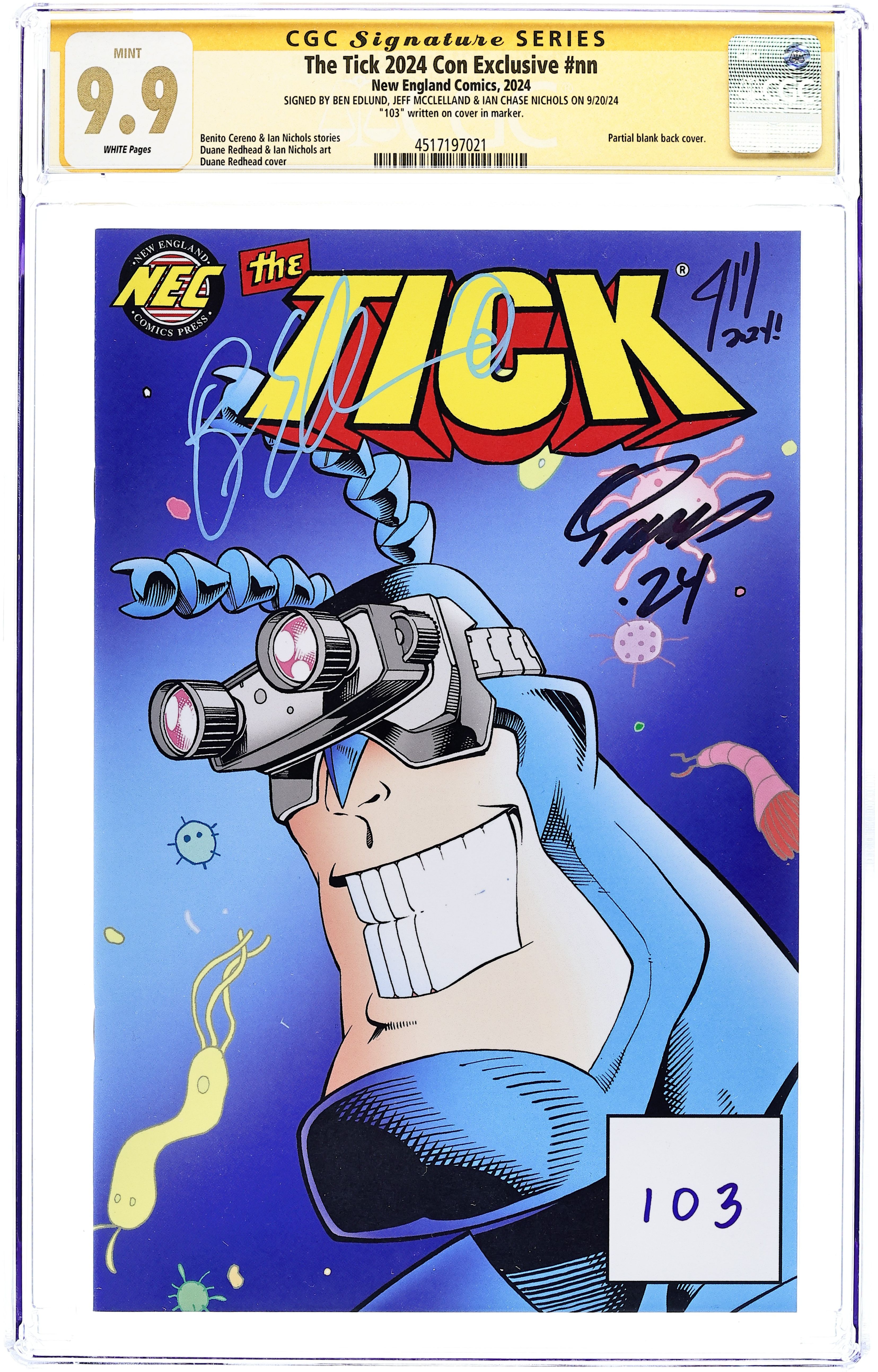 - Signed by Ben Edlund, Jeff McClelland & Ian Chase Nichols on 9/20/24. "103" written on cover in marker.