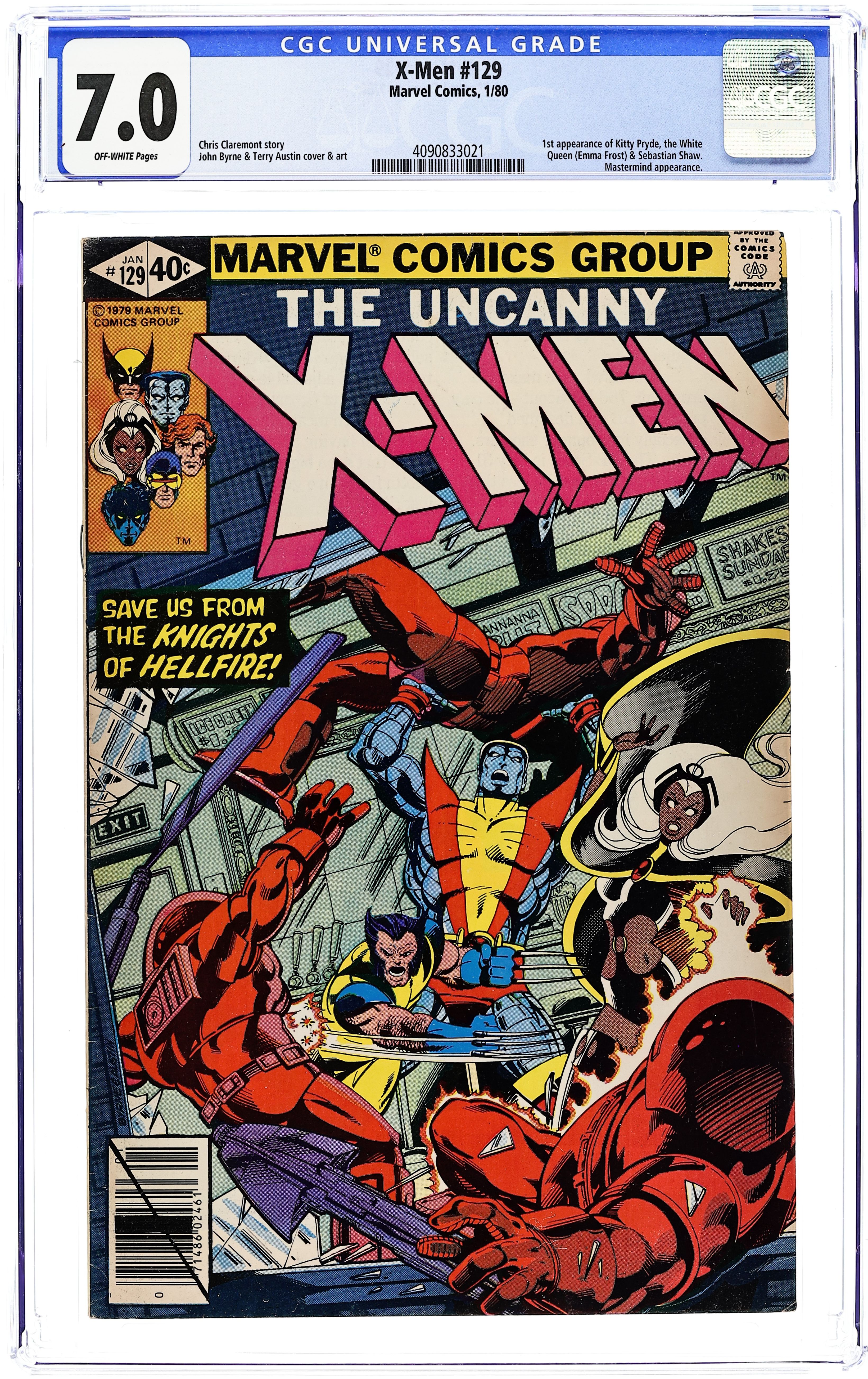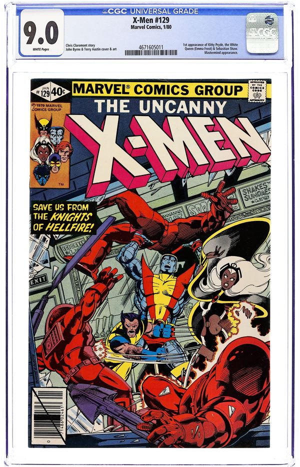Newsstand Edition. The Dark Phoenix Saga: Part 1 of 9 - "God Spare the Children!" Story by Chris Claremont and John Byrne. Art by John Byrne and Terry Austin. This issue begins arguably the greatest and most tragic X-Men adventure of all time - The Dark Phoenix Saga. While the X-Men attempt to recruit a "New Mutant" by the name of Kitty Pryde, Wolverine, Colossus, and Storm are suddenly attacked by unknown assailants. What do these armored foes want, and who is the White Queen? 36 pages, full color. NOTE: 1st appearance of Kitty Pryde and Emma Frost, the White Queen. Cover price $0.40.