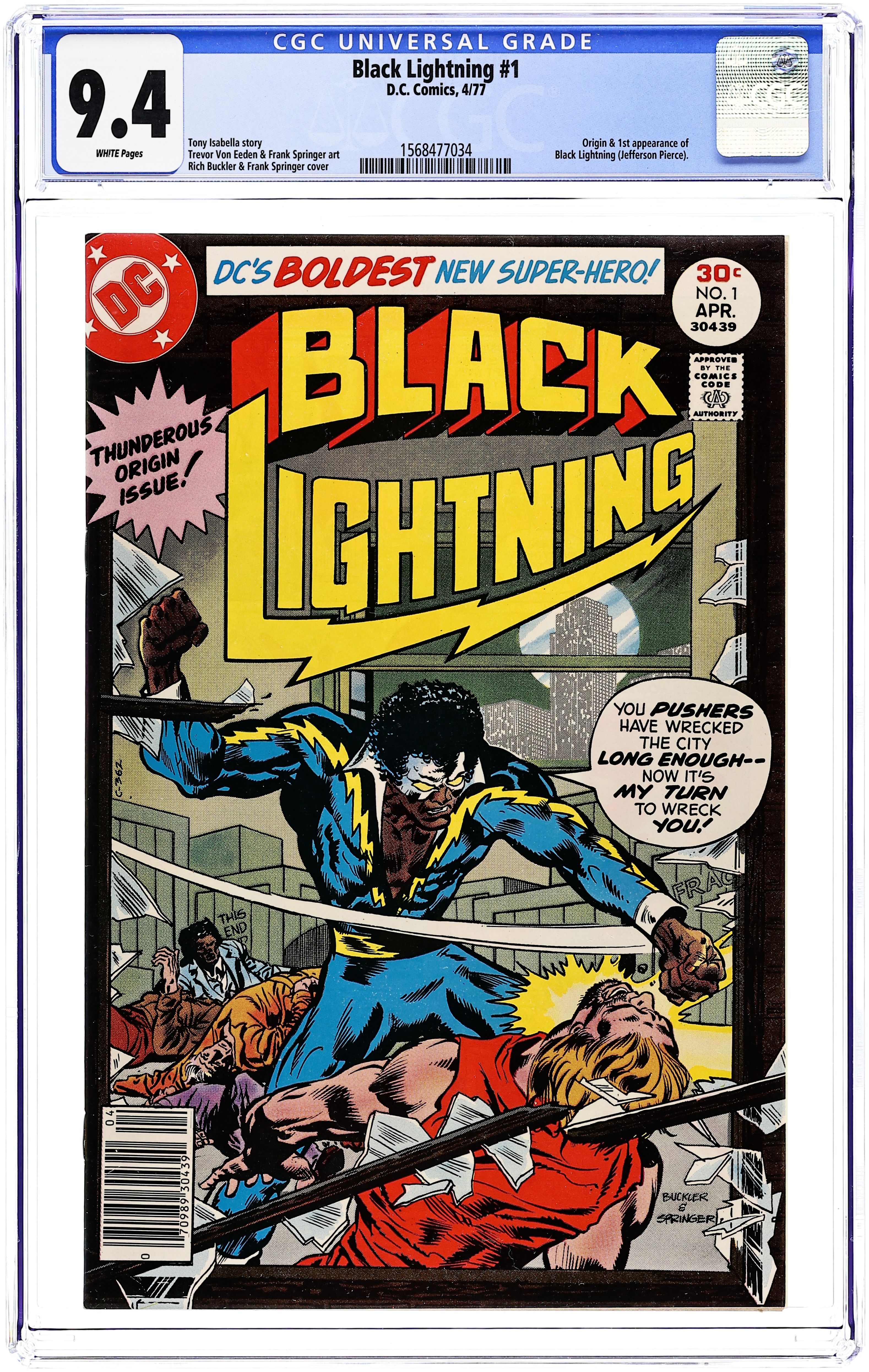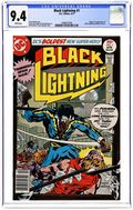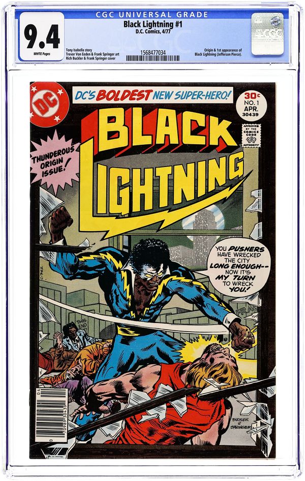 Ex-Olympic athlete Jefferson Pierce takes a job as a school teacher at an inner city school in Metropolis, commissions a costume from tailor Peter Gambi, takes on the name of Black Lightning, and goes after a group of bad guys called the 100. Script by Tony Isabella, pencils by Trevor Von Eeden, inks by Frank Springer. Cover by Rich Buckler and Springer. 1st app. of Black Lightning. Cover price $0.30.