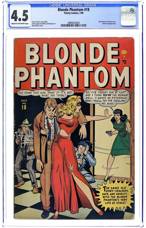 Stories by unknown. Art by unknown. The Blonde Phantom stars in "The Last Man!" and "Murder in Print!" Also in this issue: Namor the Sub-Mariner and Namora in "Terror of the Tattler!" And: 2-page text story "The Big Joke"! Characters in this issue: Blonde Phantom; Ignatius Fowler (first appearance, villain); Sub-Mariner; Namora; The Tattler (first appearance; villain). 36 pages, full color. Cover price $0.10.