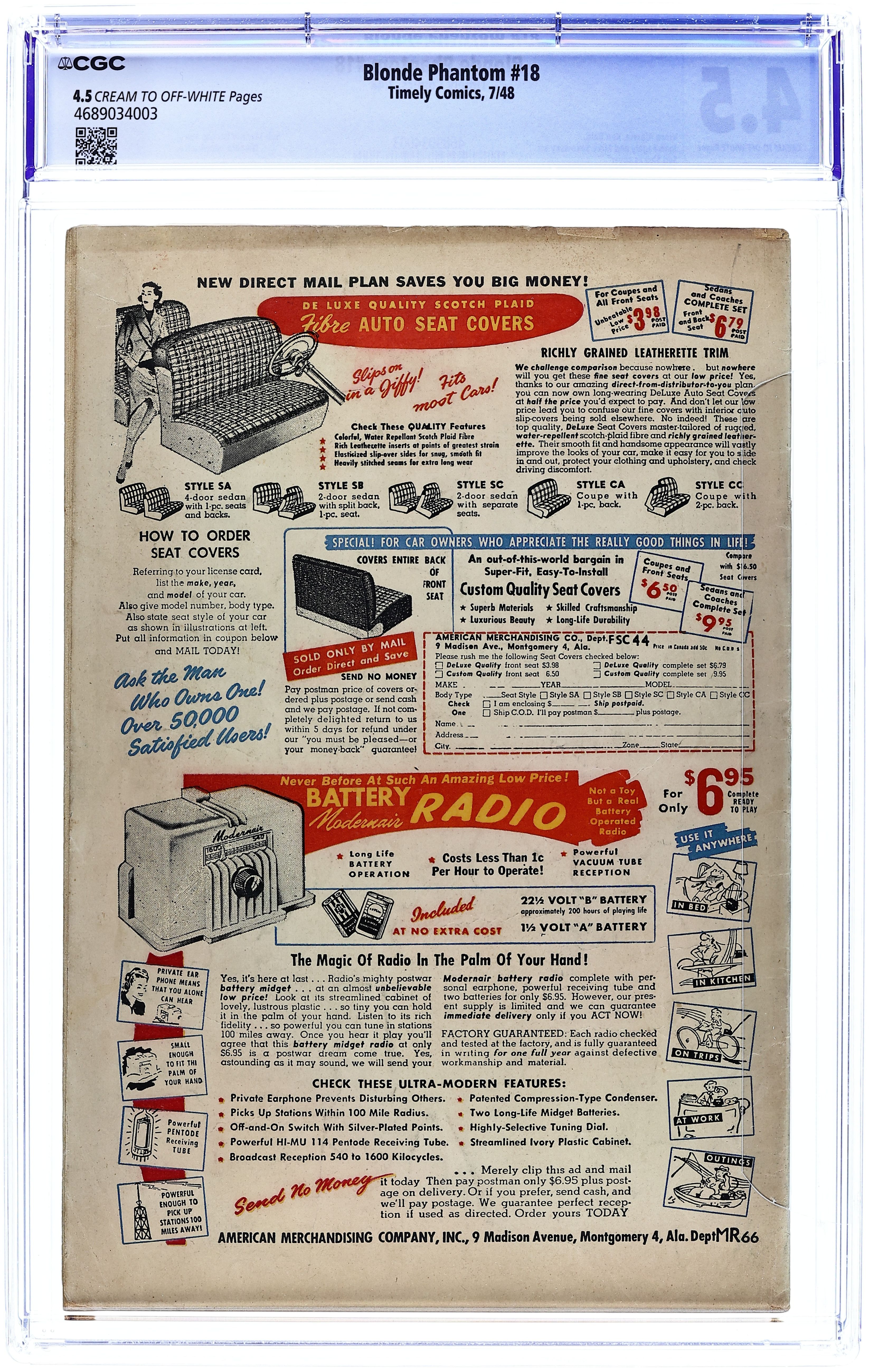 Cover pencils by Syd Shores. Stories by Bill Woolfolk, Harvey Kurtzman (Hey Look! 1-pager) and unknown. Art by Syd Shores, Harvey Kurtzman (Hey Look! 1-pager), Vince Alascia and unknown. The Blonde Phantom stars in "Modelled for Murder!" with splash page pencils by Syd Shores, and "The Sultan Strikes!" with story by Bill Woolfolk and splash page art by Syd Shores and Vince Alascia. Also in this issue: Captain America in "The Murder at the Mardi Gras!" with story by Bill Woolfolk (and pencils by Rico?); untitled Hey Look! 1-pager by Harvey Kurtzman; "The White Vision" text story; and untitled stamp collecting article. Characters in this issue: Blonde Phantom; Stillface (first appearance; villain); Captain America [Steve Rogers]; Bucky [Bucky Barnes]. 32 pages, full color. Cover price $0.10.
