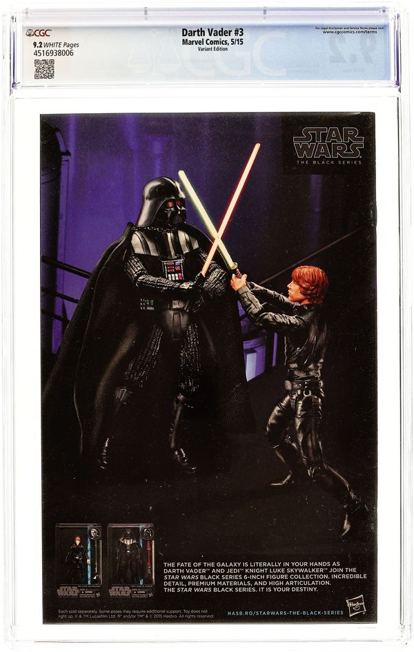 "Anakin Skywalker" Action Figure Variant Cover by John Tyler Christopher. Written by Charles Soule. Art by Giuseppe Camuncoli. Cover by Charles Soule. The most fearsome villain of all time returns with an all-new series! When Anakin Skywalker fell, both to the pull of the dark side and to the blade of Obi-Wan Kenobi, he rose back up, more machine than man. Having lost everything that was once dear to him, the former chosen one must take his first steps into a darker world…as Darth Vader, Dark Lord of the Sith! Join Vader as he learns a new way - the way of Darth Sidious and his newly formed Empire…the way of the dark side. 44 pages, full color. Rated T Cover price $4.99.