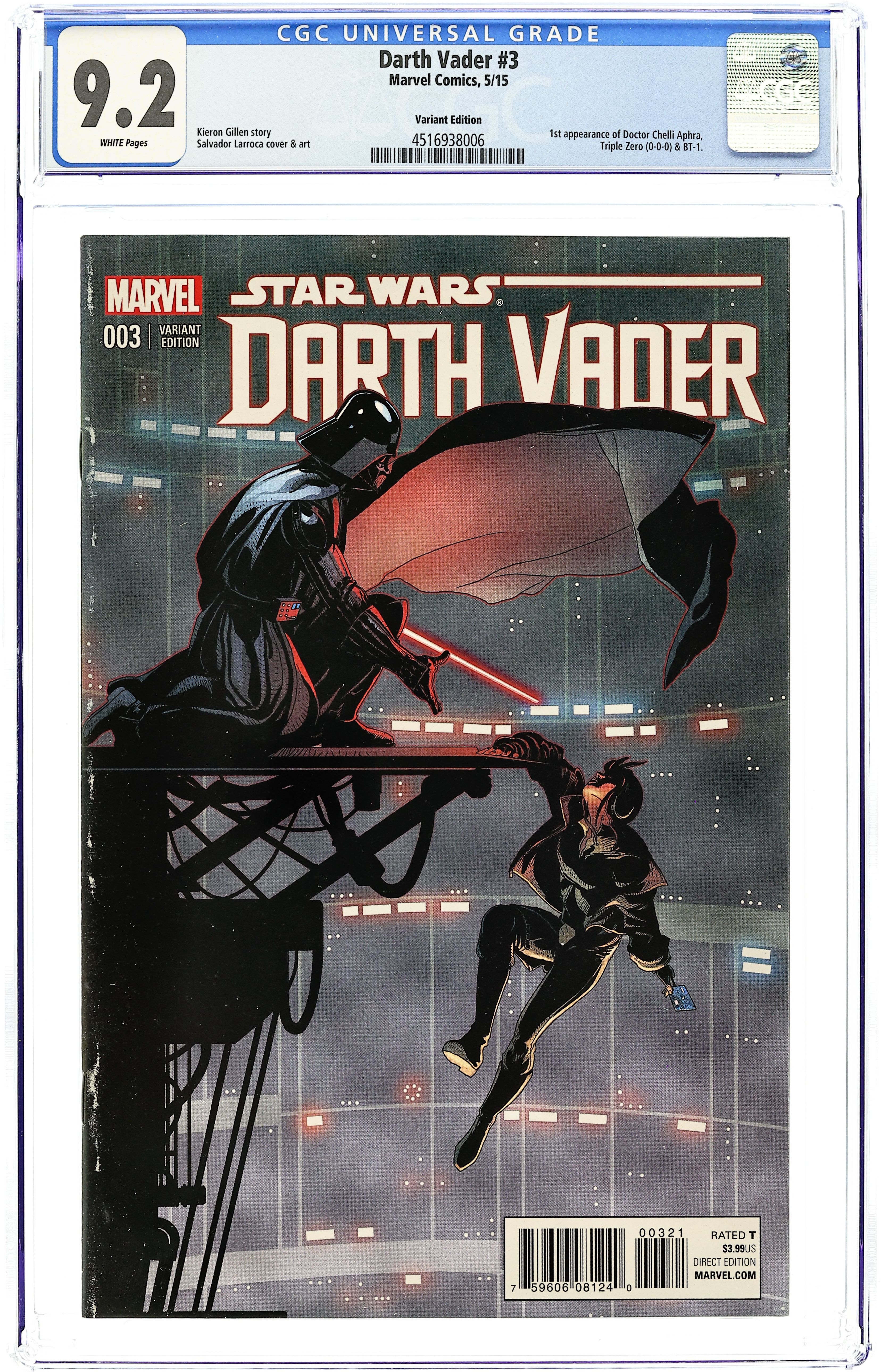 Written by Kieron Gillen. Art by Salvador Larroca. Cover by Adi Granov. When a Dark Lord needs help, who can he turn to? Meet Aphra-the galaxy's foremost raider of lost weaponry! Plus: could these be the deadly droids she's looking for? 28 pages, full color. Rated T Cover price $3.99.